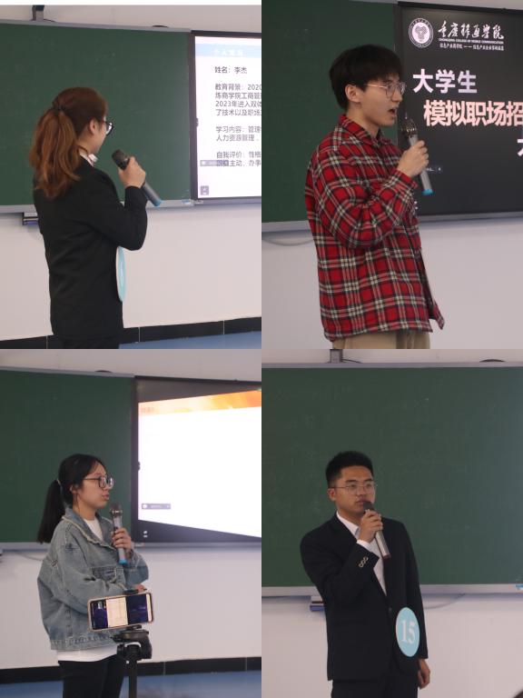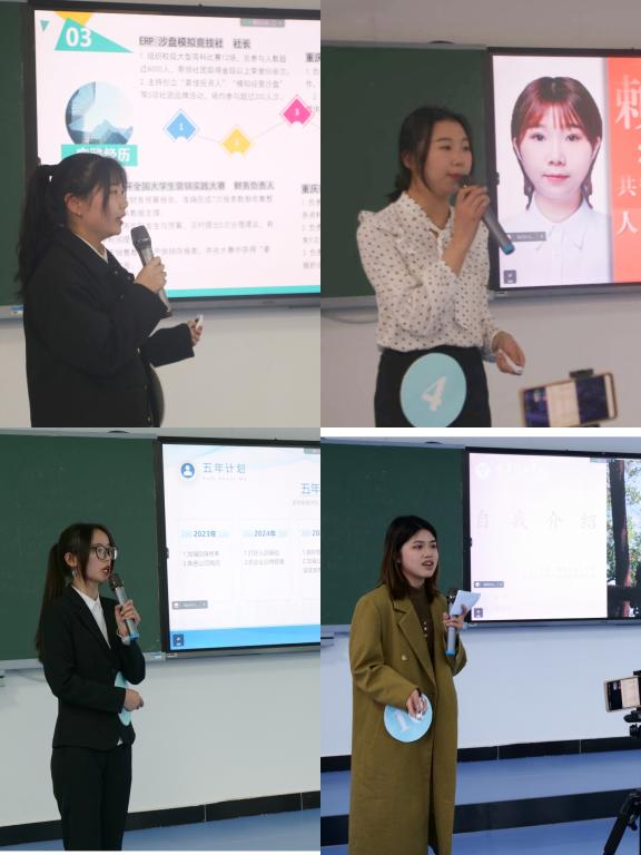 “吾生也有涯,而知也无涯。”一张张简历是选手们个人能力的呈现,一句句对答如流的话语是面对问题时的游刃有余。活动伊始,选手们依次通过ppt的方式进行一分钟风采自我介绍。在选手的自我介绍中,有为策划一场完美婚礼的策划师;有为让顾客选择适合自己车辆的销售经理;也有为公司选择优秀人才的HR。台上选手们自信笃定,神采飞扬,台下选手着装正式、严阵以待,面试现场严肃认真、秩序井然,一场没有硝烟的战争即将打响。选手们落落大方的表现,侃侃而谈的身姿赢得评委席老师们一致肯定。