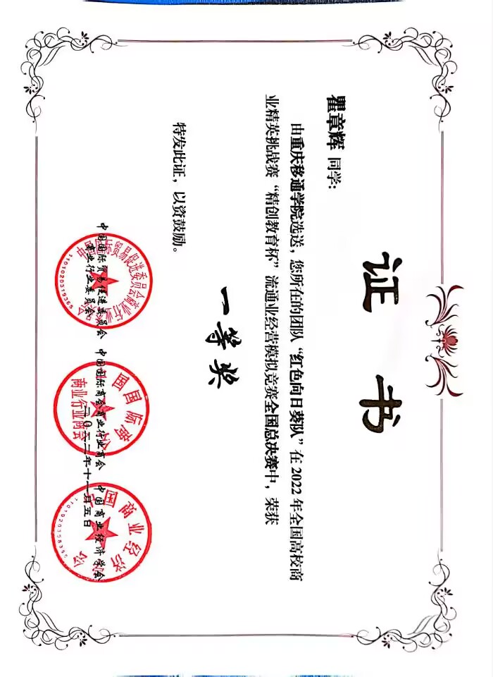 博学慎思,明辨笃行,争做优秀学生。通过不断地沉淀与积累,她在学习方面刻苦专研,态度认真,目标明确,成绩一直名列前茅,专业平均分保持在90分以上,连续两次获得校级一等奖学金。作为一名学生,我们的首要任务是学习。她深知,作为一名基础相对较差的学生,只有比别人更加努力,才能变得优秀。她始终笃定一个信念“人生在勤,不索何获”,唯有拼搏奋斗,方能有所成就。在学习基础专业课的同时,她也会不断延伸拓宽,参加相关专业竞赛,通过团队与自己的不懈努力,最终在2022年全国高校商业经营挑战赛“精创教育杯”流通业经营模拟竞赛全国总决赛中,荣获一等奖的佳绩,并在大二学年学习专业课之余通过了大学英语CET四级考试以及计算机二级。