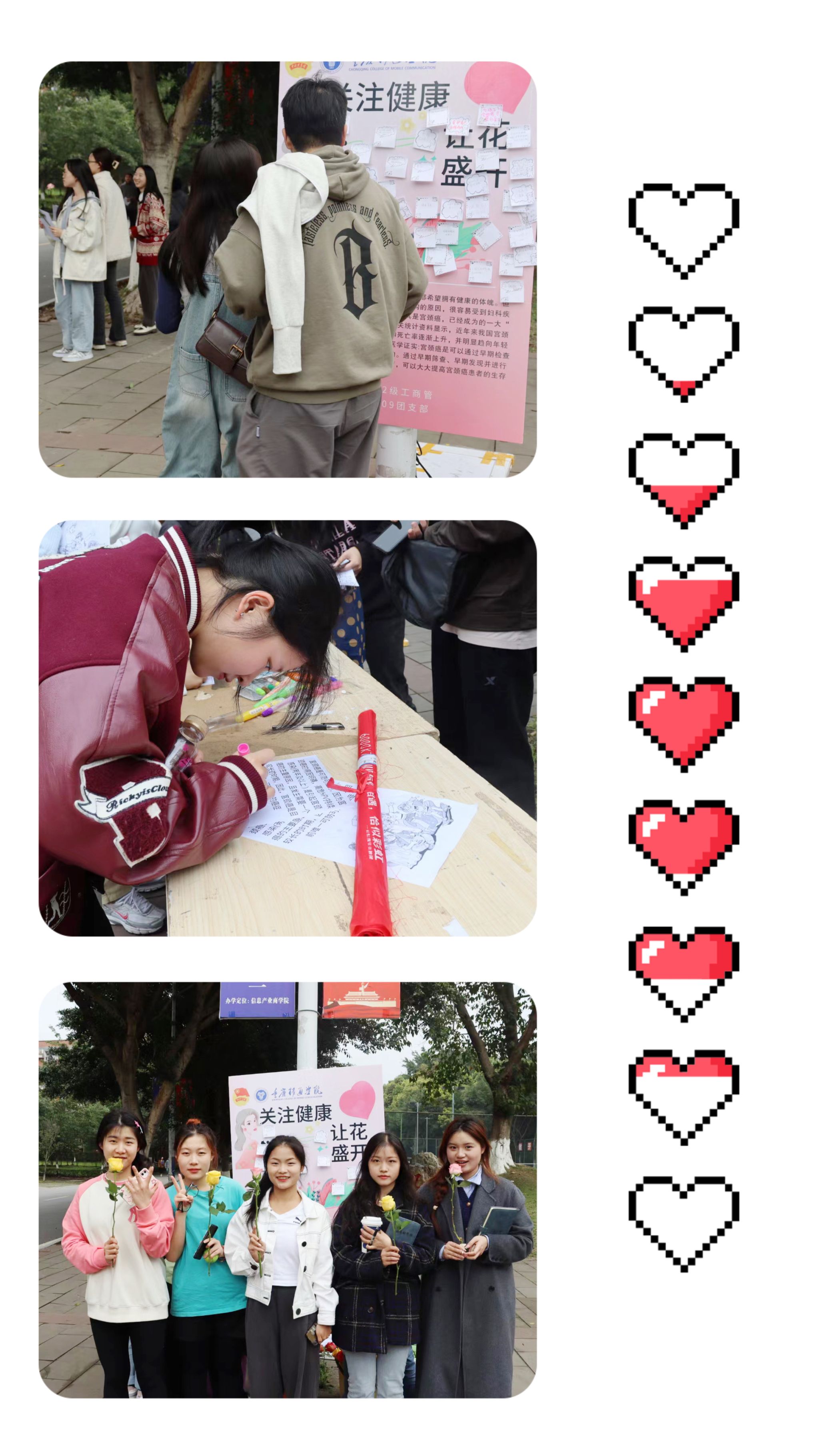 纸上得来终觉浅,绝知此事要躬行。同学们在图书馆门口小广场上进行鲜花留言活动,参与的同学在宣传板上留下许多关爱女性健康的话语,有“关注女性健康,关注自己健康”“关注癌,重视爱”“爱自己,是浪漫的开始”等等,随后得到一朵犹如女性生命般怒放的鲜花和一张有关宫颈癌预防与危害的宣传单。在这些举动下,校园中的同学纷纷参与进来,更多的人从中了解到宫颈癌的伤害性,知道宫颈癌能够通过接种疫苗来预防,关注到女性健康。随后同学们又一同去清除附近公厕和电线杆上恶意引导女性的小广告,用行动表现同学们对关注女性健康所做出的努力,变成照亮黑暗角落里的那束微光。也让同学们的理解更深刻。