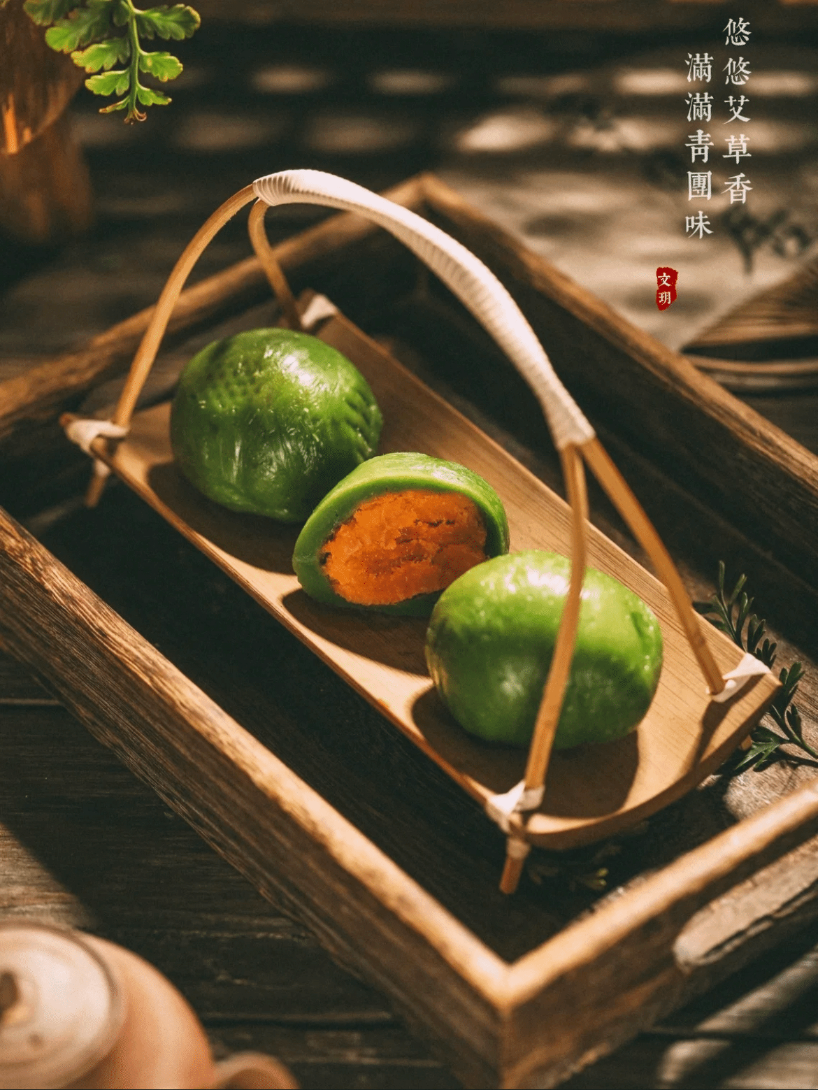 青团又称为“艾草青团”、“清明果”、“茨壳粿”等。青团之称大约始于唐代,现已有1000多年的历史。青团虽然流传千百年,但外形没有显著变化,作为祭祀品的功能也日益减少,如今成了一道人见人爱的小吃。