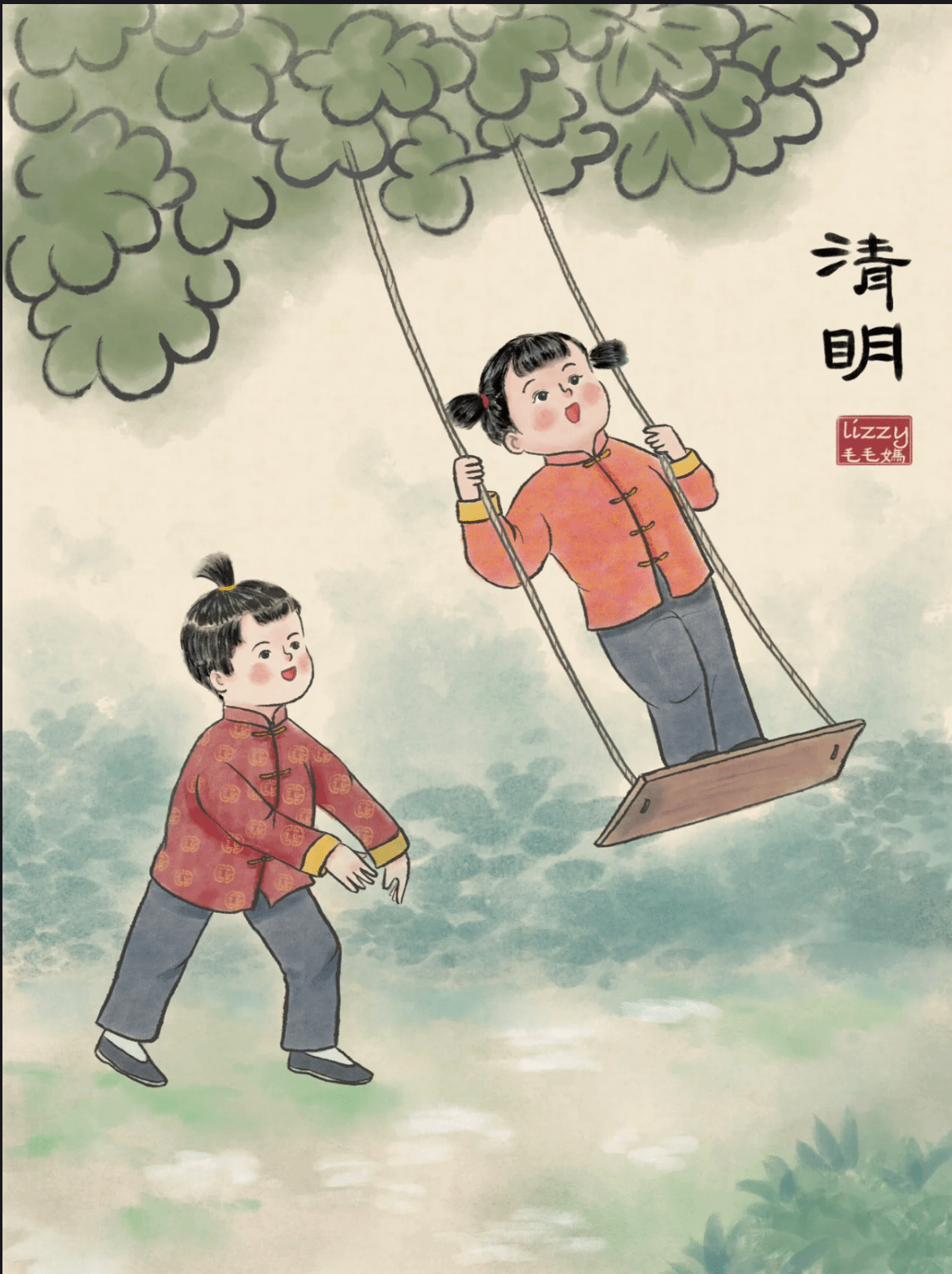 扫墓祭祖与踏青郊游是清明节的两大礼俗主题,这两大传统礼俗主题在中国自古传承,至今不辍。除此之外,还有“人间四月天,清明时节放纸鸢”的放风筝;在古时有祝天子“千秋之寿”含义的荡秋千;吃用草汁和淀粉混合,里面包上豆沙、芝麻等馅料,捏成小团蒸熟的碧绿晶莹的“青团”。