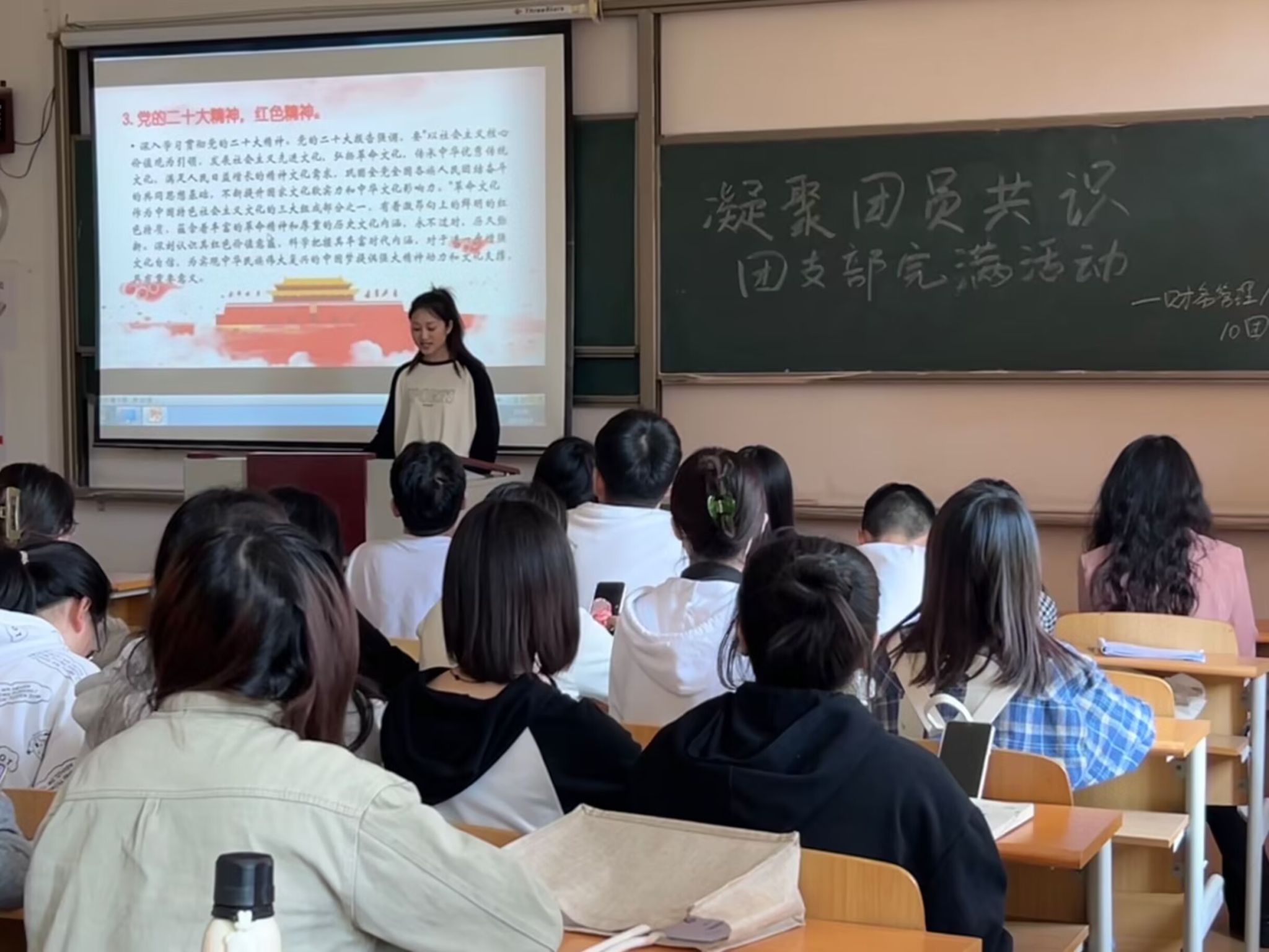 学史明理、学史增信、学史崇德、学史力行。支部全体同学在活动上进行了“胶片里的红色映像”的观影学史环节。在观看《建党伟业》选段后,同学们无一不为仁人志士抛洒热血而悲痛,无一不被红船上的十三位代表感动。当代表们合唱《国际歌》时,同学们都深刻理解了党的建立为黑暗的中国点起了一盏明灯的划时代意义。观影之后,支部书记带领大家解读了二十大中的十年回顾。从党的源头体悟党的脚步,进一步准确把握党的历史发展主线,深入体悟党的初心与使命。时代不断出题,奋斗与奉献要一脉相承。我辈青年应当将个人奋斗融入党和人民事业,谱写奋斗于时代、奋斗为人民、奋斗向未来的新篇章。