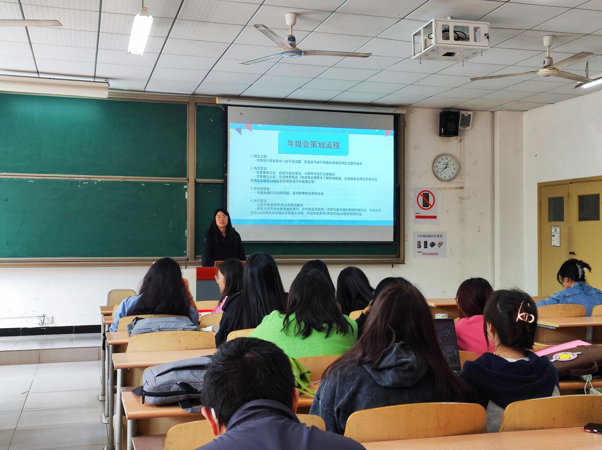 随后,为确保每次年级会的顺利开展,增强班与班、同学们之间的凝聚力,陈老师对年级会策划流程进行了详细讲解,从确定主题、构思策划、完成申报表、执行策划四个方面进行 ,通过介绍整个完整策划流程让各班委对年级会有了进一步的认识,让大家在每一次年级会中有所思、有所想、有所得,使我们的年级会越来越好,越办越辉煌!