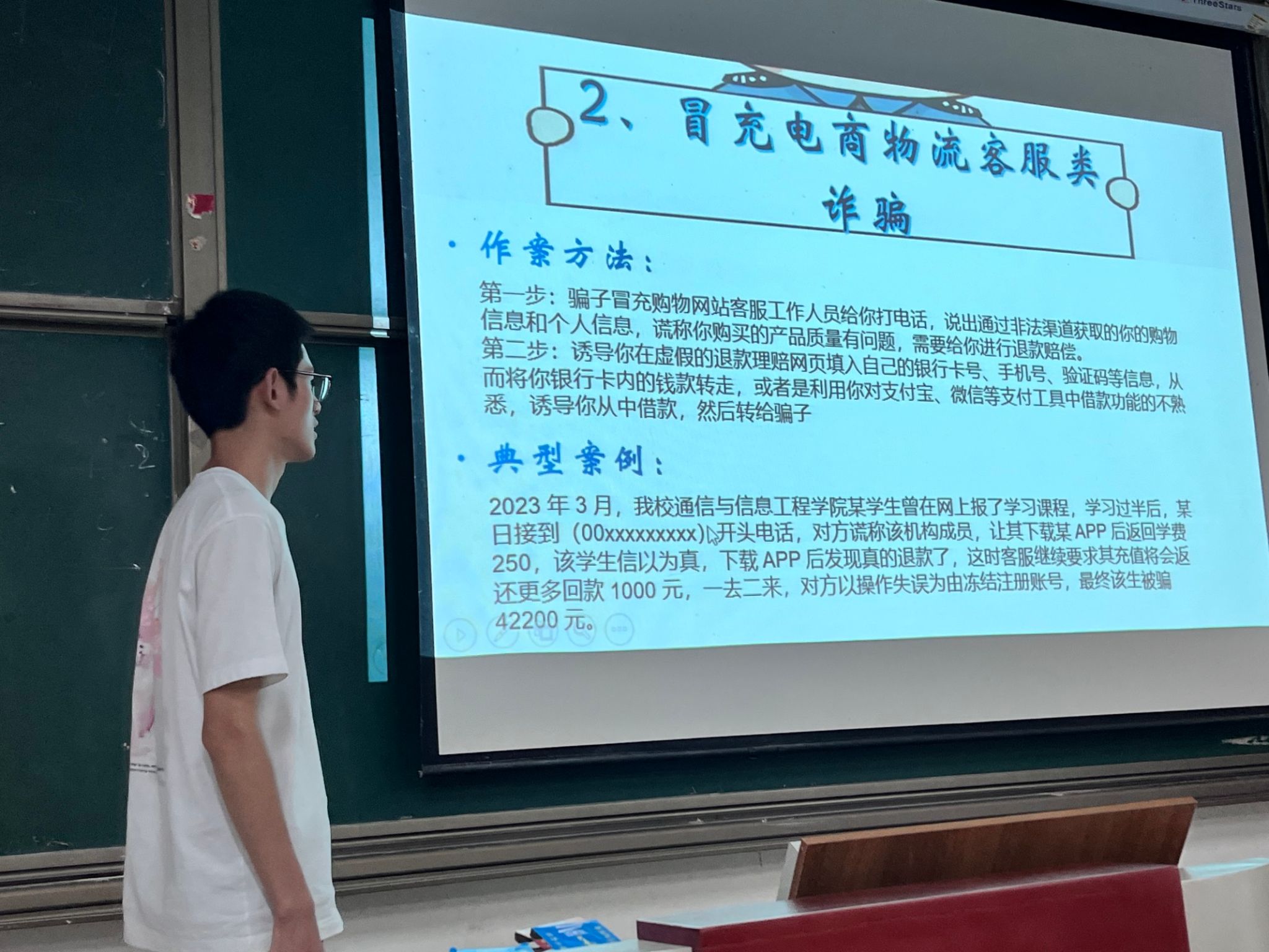 花花世界迷人眼,多种诈骗谨防点。诈骗手段层出不穷,“新发明”的不断更新,使大学生愈来愈难以分辨真假。会议初始,辅导员张鑫老师结合身边实际案例为同学们详细讲解了刷单返利类、网络游戏虚假交易类、网络货款类、注销“校园贷”、虚假投资理财类、网络招嫖类等十种常见诈骗类型以及作案手法,提醒同学们要以案为鉴,谨防上当受骗。