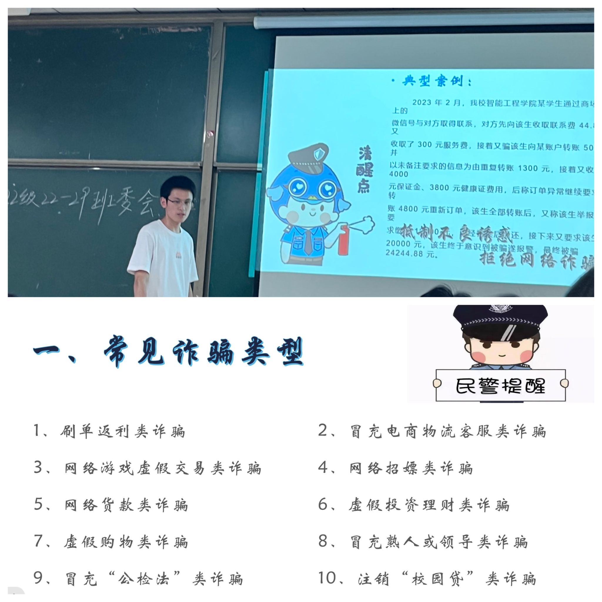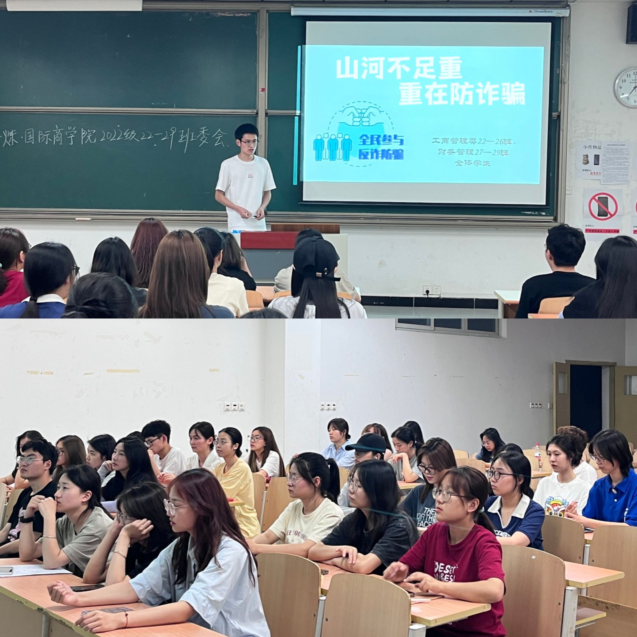 动动手指高工资,为何馅饼砸中你。随着网络时代的高速发展,大学生诈骗案件频频发生,诈骗手段花样百出,令人防不胜防。为提高学生“反诈防诈”的安全意识与能力,全力保障学生财产安全,构建文明、平安校园。淬炼·国际商学院2022级工商管理类22-26班、财务管理27-29班于2023年4月19日下午在五教5105开展“山河不足重,重在防诈骗”主题班委会。