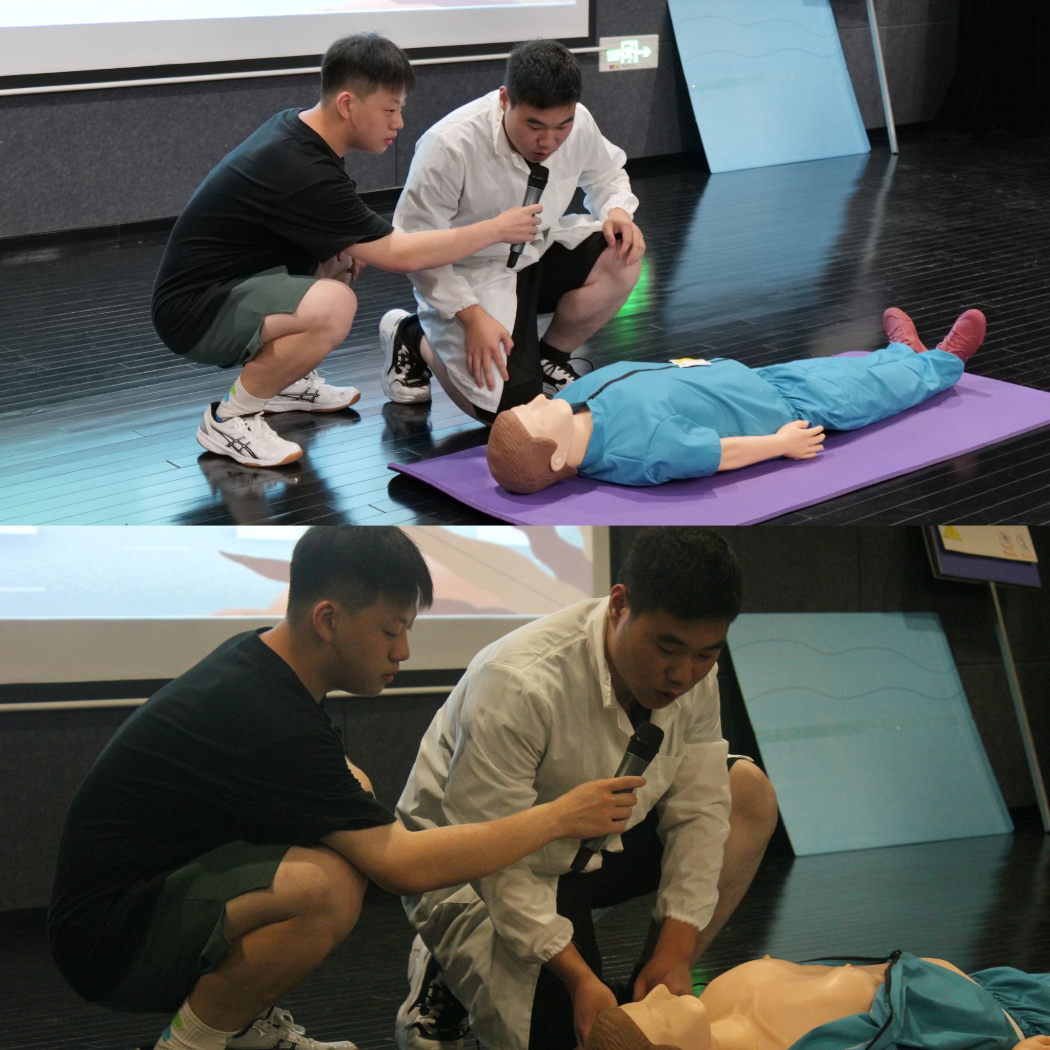 学急救知识,保生命安全。田威教练用生动凝练的语言为同学讲解心肺复苏“六步法”:一、观察周围环境是否安全;二、判断患者有无意识;三、判断有无呼吸;四、判断有无心跳;五、按压胸腔进行心肺复苏;六、进行人工呼吸。田威教练一遍又一遍的心肺复苏抢救动作牢牢地烙印在同学们的脑海中,同学们跃跃欲试,刘万芳与毛小东同学率先获得心肺复苏学习演示机会,“五二零”的指令是同学们对本次心肺复苏知识学习的最好诠释,也为以后工作中处理紧急情况打下了良好的基础。