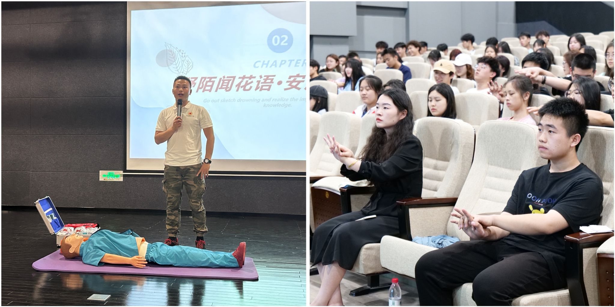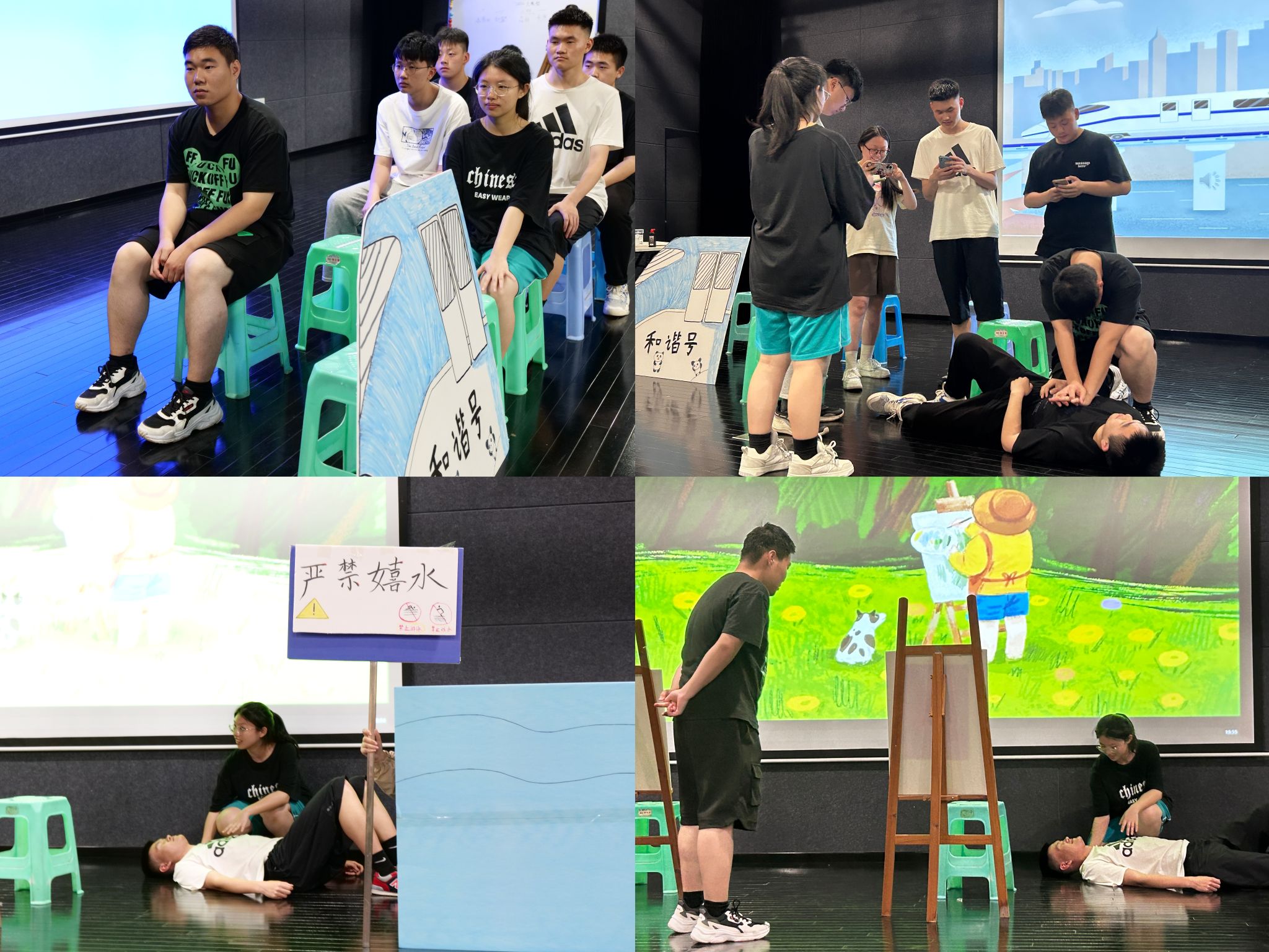应急有预案,临事不慌乱。日常生活中往往遇到一些由于自身应急知识的匮乏而造成心有余而力不足的突发事件,致使错过了最佳施救时间。本次年级会以“列车急救”情景剧作为开端,乔展鹏同学饰演一名乘客在旅程中发生无意识晕倒,车厢内饰演医生的彭辉同学以正确的心肺复苏手法进行救援;林媛、阎文华同学还原溺水事故现场,让同学们在观看情景剧的同时能够认识到生命诚可贵,学习到应急知识的重要性。