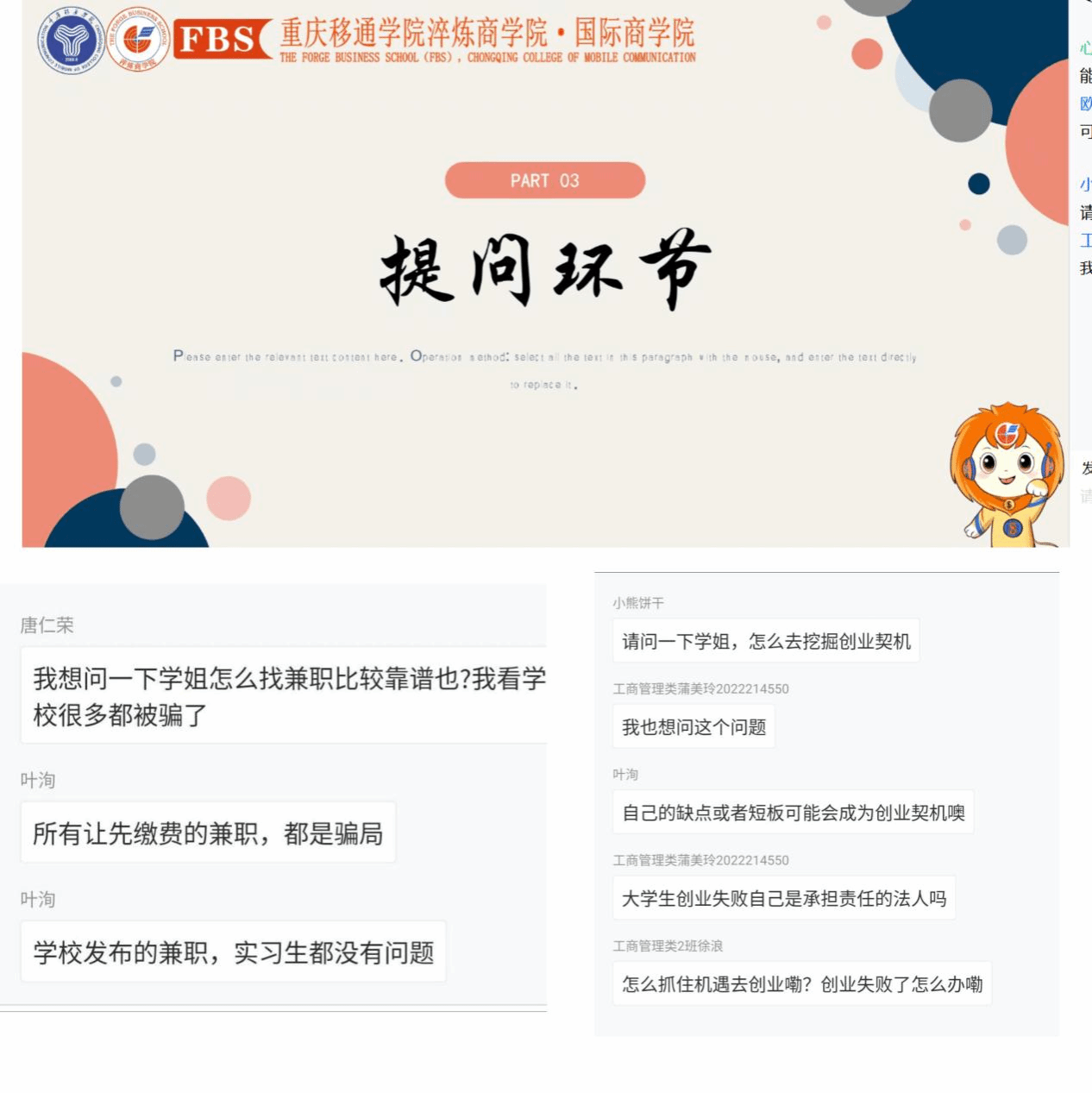 不断探寻,抓住机遇。同学们提出怎样去挖掘创业契机、如何抓住机遇去创业、创业失败了怎么办、如何寻找兼职等相关问题,赵爽学姐热心解答告诉同学们要学会观察当时阶段遇到的困扰,多向学校辅导员、任课老师、亲戚朋友请教,在谨慎的同时也要善于抓住机会大胆的迈出第一步。与其仓惶的追逐日落,不如静待满天繁星。