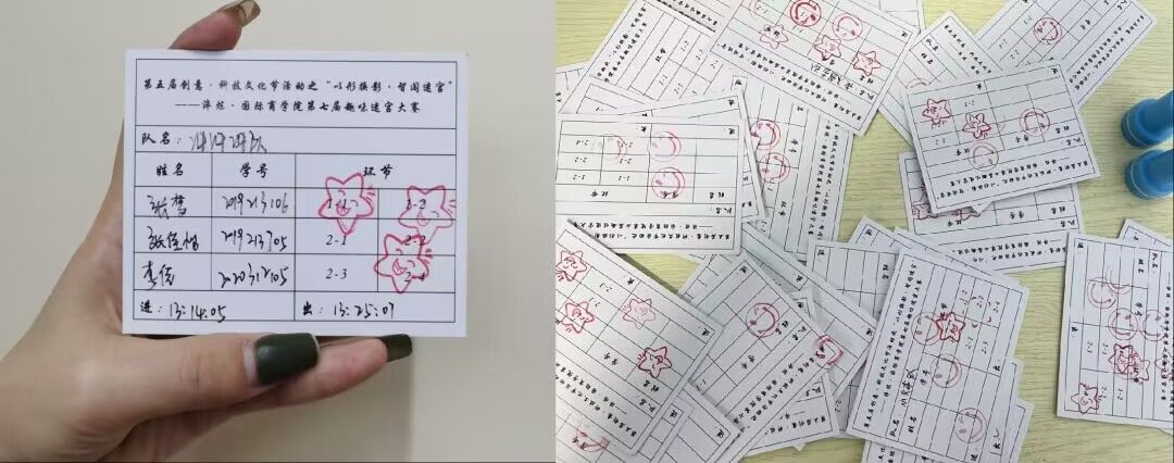 参赛团队抽取游戏点打卡顺序,根据抽取的打卡顺序进入教学楼(指定入口)进行打卡,打卡成功后去往下一个打卡点,共需要打卡三个点位,全部打卡成功即可走(指定出口)出教学楼前往实体迷宫,在实体迷宫处,蒙眼走出迷宫并完成指定任务的团队即为成功。初赛采取计时排位制,进入教学楼即计时开始,出为结束,前往实体迷宫的路程时间不计入,实体迷宫另外计时,打卡时间和实体迷宫时间相加为最终用时,用时最短的前十支队伍进入决赛。