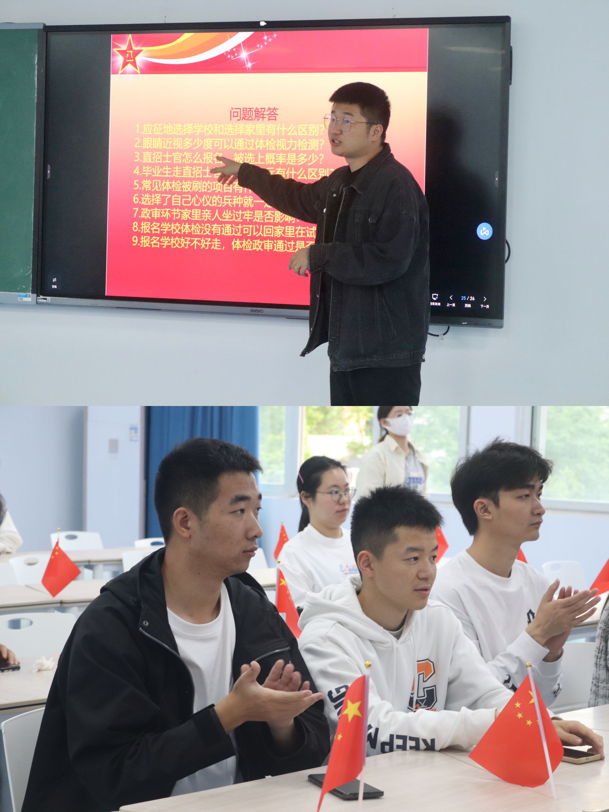 国家兴亡,匹夫有责。张旭老师围绕征兵工作新形势新政策,激情澎湃地向同学们宣讲了在校大学生参军应征条件、报名流程、优待政策、军官退役安置以及相关政策,充分调动了同学们报名应征的积极性。张旭老师也鼓励同学们应该把个人理想融入到强国梦、强军梦中去,参军入伍一直以来都是最直接的服务国家方式,作为当代青年大学生,将自己的青春献给祖国是无比光荣的一件事情!