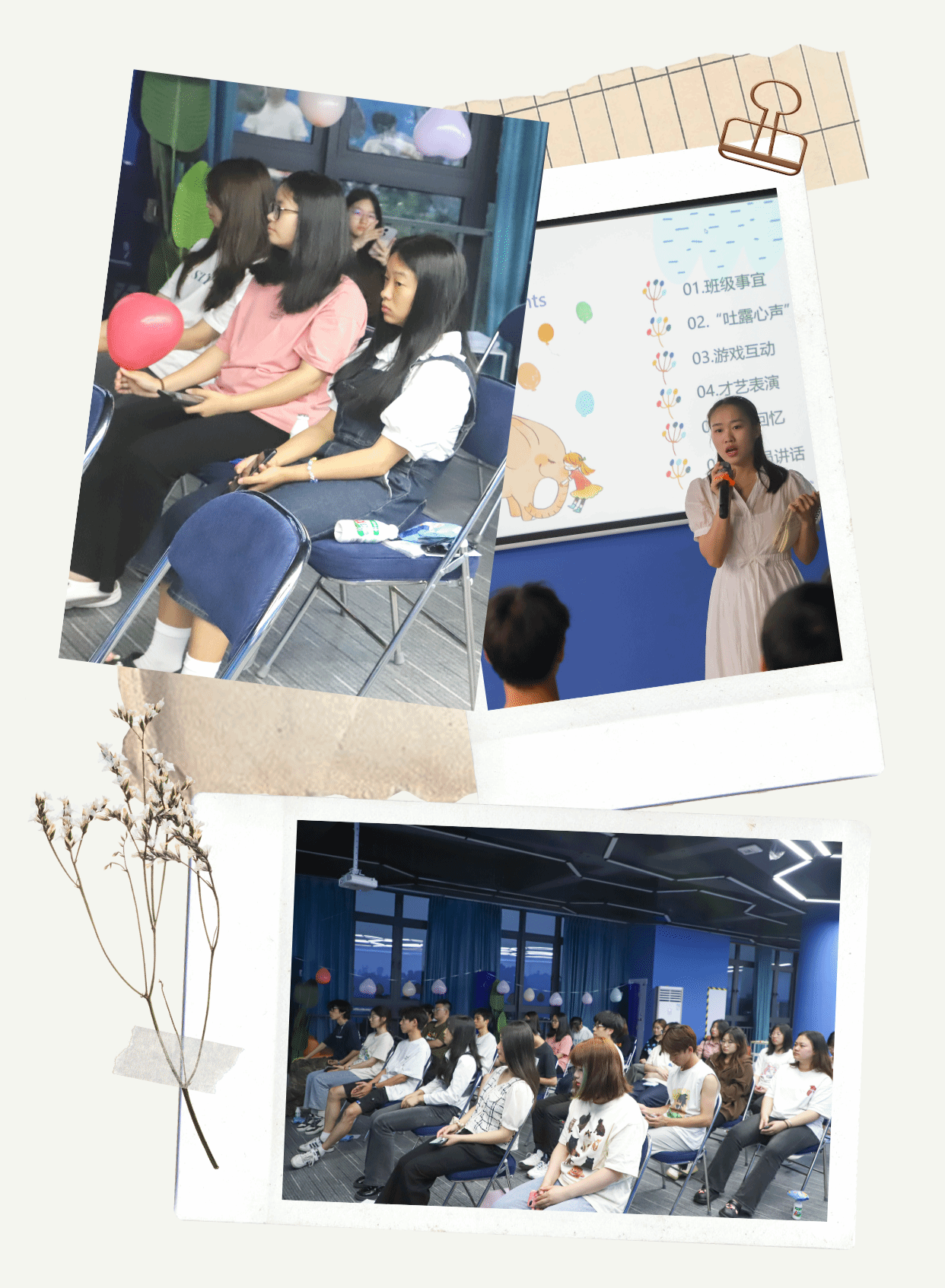 在谁是卧底,指压板,记忆力大比拼等小游戏的欢乐下,班长邓莹莹带大家开启了一场文化娱乐之旅!脑力记忆的测试有些困难,正话反说的转换也有难度,而谁吃柠檬和谁是卧底则考验着演技和观察力。这里的多种有趣的游戏,让同学们一边利用自己的智慧和勇气赢得奖品,一边分享快乐与知识,共同享受学习和娱乐的时光。同学们开怀的笑意里,不难看出“春风得意马蹄疾,一日看尽长安花”的愉悦之感。