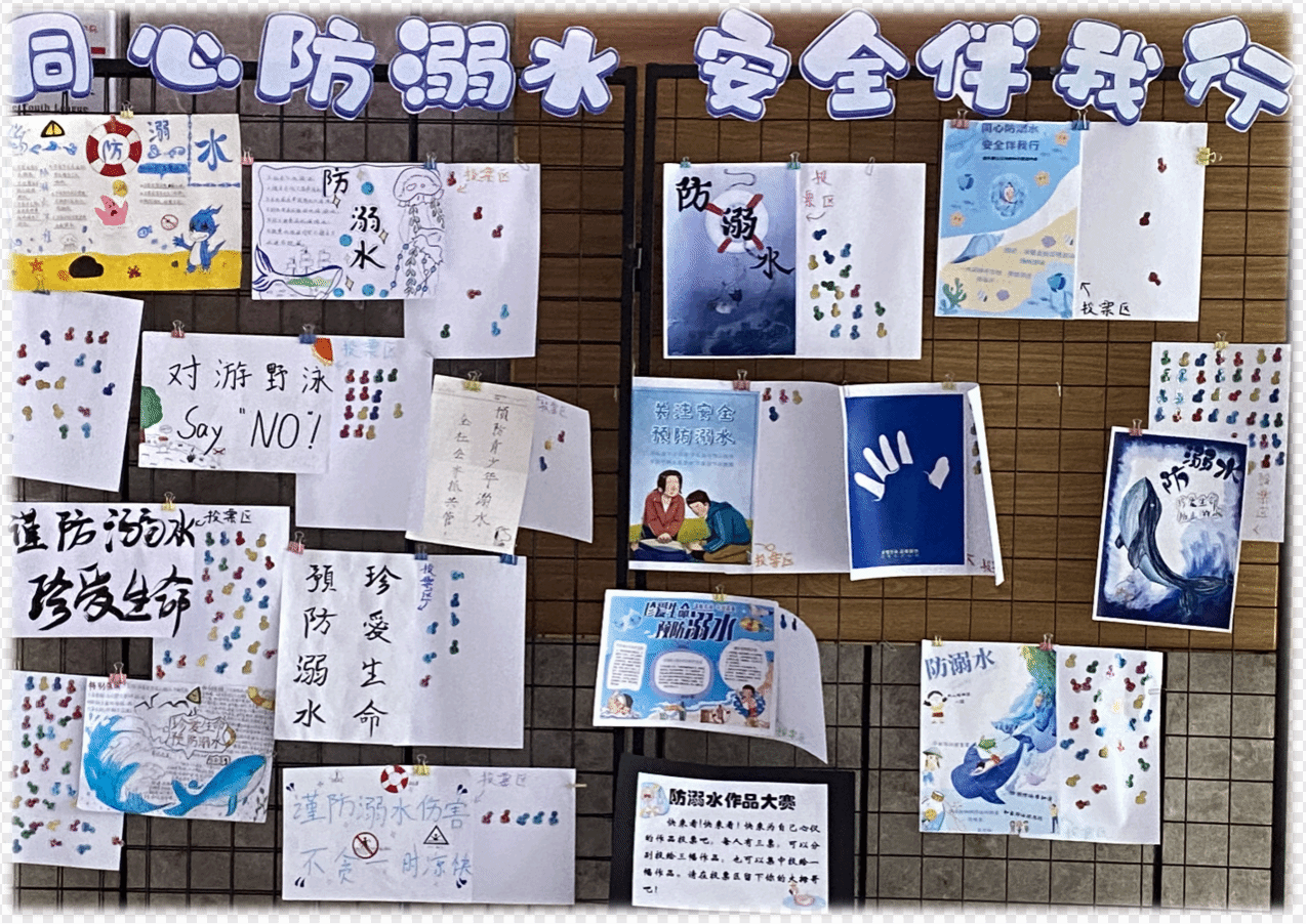 为提高同学们的安全意识,让同学们更广泛的参与到防溺水安全教育中来。我们在年级会前开展了全年级防溺水作品大赛,并在第五教学进行展览和线下“点赞”投票。在经过了同学初评、老师终评后评选出了前三名共6位选手,在年级会现场举行了颁奖仪式。通过主题作品征集,手抄报展示等活动,引导学生牢牢树立远离危险水域意识,提高自救能力。