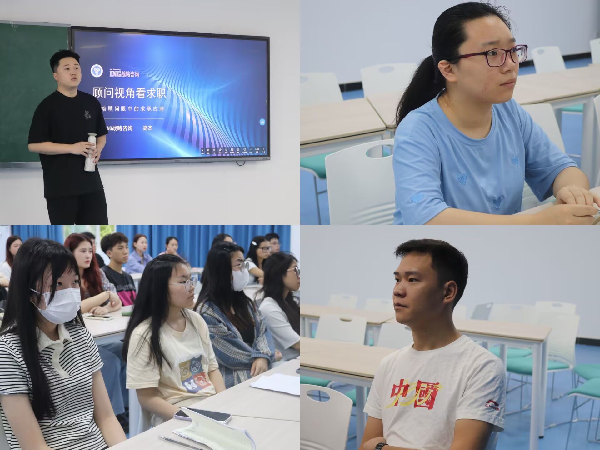 海阔凭鱼跃,天高任鸟飞,人生有多种无限可能。高杰校友分别从就业、创业、择业三个角度出发畅聊发展之路,为商学院学子点亮了前行的灯塔。在交流过程中,有学弟们问道:“学长作为一个创业成功的例子,那请问学长建议大家创业吗?”高杰校友回答道:“就业,兢兢业业、勤勤恳恳工作,为人生奋斗;创业,披荆斩棘,无限可能,未尝不是一个好的出路;对于刚毕业的同学,稳定很重要,就业是最好的选择;但是对于有梦想、敢拼搏的年轻人来说,创业更具有挑战性,就此显得尤为重要了。人生本有无限可能,努力向前,乘风破浪,开创属于自己的时代,就是最大的成功。”