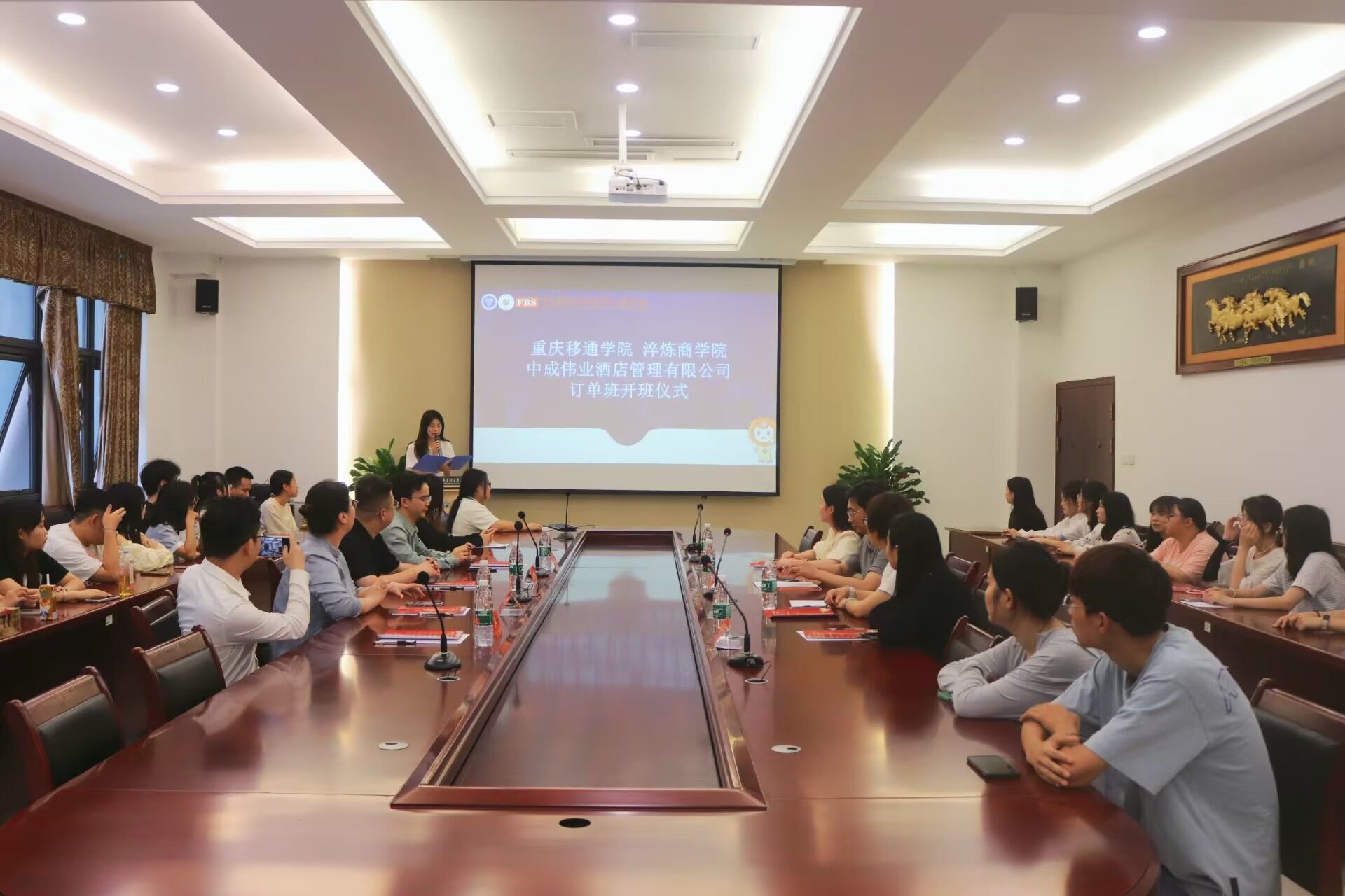 为促进学生就业,加强校企合作,促进教学与实践的结合,把商院学子培养成为社会所需要的人才。2023年6月7日13:30重庆移通学院淬炼商学院中成伟业酒店管理有限公司订单班开班仪式在行政楼A栋107会议室成功举办,参加本次开班仪式的领导及嘉宾有:中成伟业集团公司人力资源部主任张洁馨、中成伟业运营经理李晓明、中成伟业重庆公司部长吕兵、中成伟业重庆公司咨询顾问曹春茂、重庆移通学院校长助理淬炼·国际商学院院长张平、淬炼·国际商学院副院长曾璐、淬炼·国际商学院学工副院长刘薇唯、淬炼·国际商学院就业创业办公室主任杨伦芳,以及订单班的全体同学们。