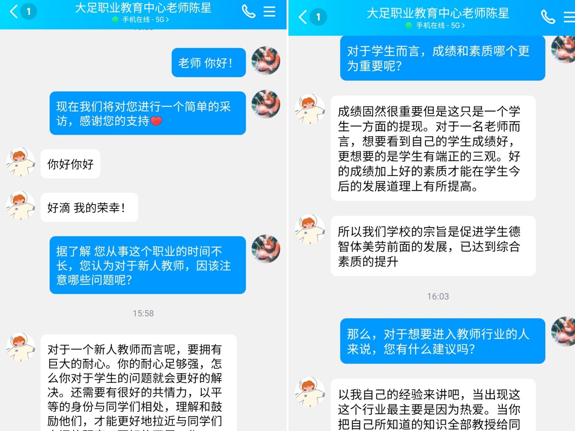 姜丽老师就此谈到:也许在以前人们仅仅看中的是成绩,但随着社会的进步,人们过多的看中的是一个人的素质。所学的知识到他走入社会只能用到其中的一小部分,而能让他受用一生的则是伴随成长他获得的各种优秀品质。梅月红老师也说到:就如学校的完满教育,开展思政课等都是为了进一步培养学生的素质,不管是专业素质还是综合素质都是一个学生成功路上不可或缺的重要部分。陈星学姐也表示肯定,并说道:每一位老师都希望自己的学生成才,但是成才的基础是自身的聪明再加上端正的三观,这样才能在今后的路途中稳步前行。
