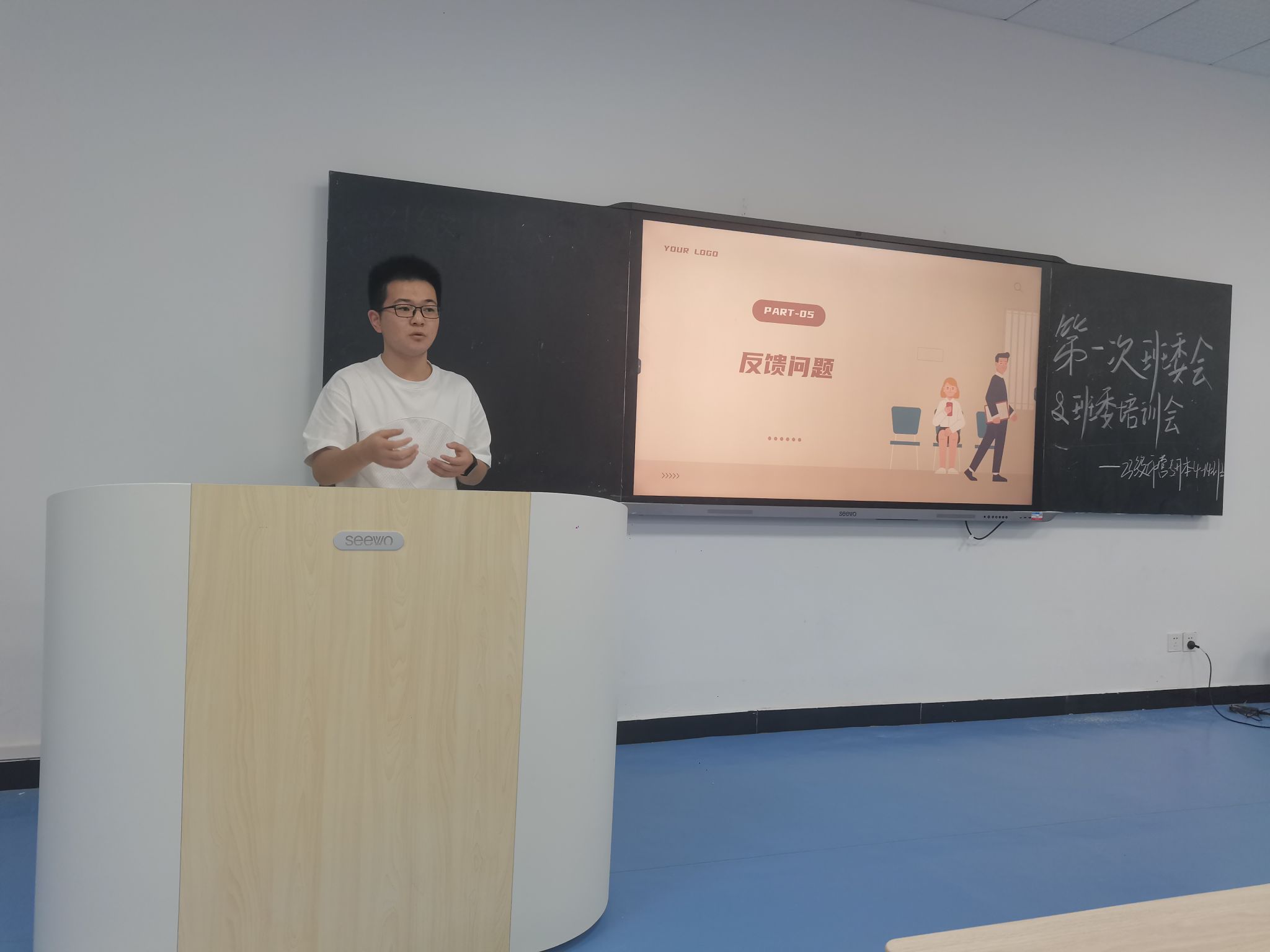 本次会议开始第一小节由年级长王浩同学从近一周工作细节问题入手,他逐一列出问题所在,提出多种问题解决途径,在问题中深化各班委职能责任,强调班委服务意识。