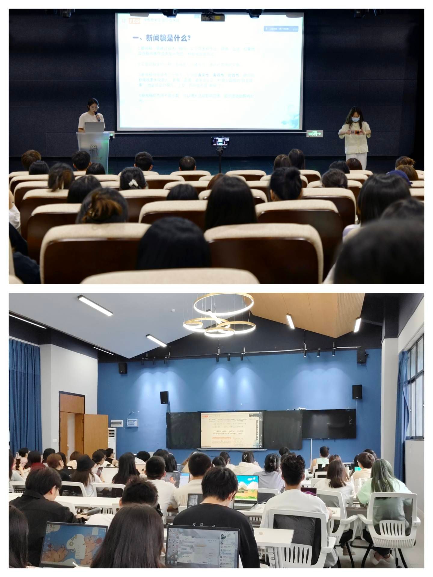 一篇好的新闻稿从标题做起,标题就是写新闻稿的头。新媒体工作室部长唐可馨同学从新闻稿是什么?新闻稿怎么写?新闻稿格式、新媒体工作室推稿需知四个方面为切入点,首先为大家介绍了新闻稿的基本定义,并着重强调了新闻稿标题的重要性。通过列举一些新闻稿的标题,将标题的拟取手法进行分析对比,让学员们了解到在标题当中恰当的使用数字、悬疑、谐音等等修辞手法的好处,同时唐可馨也鼓励学员们在平时的生活当中多读、多写、多看,把优秀文章的精髓运用到自己的新闻稿当中。