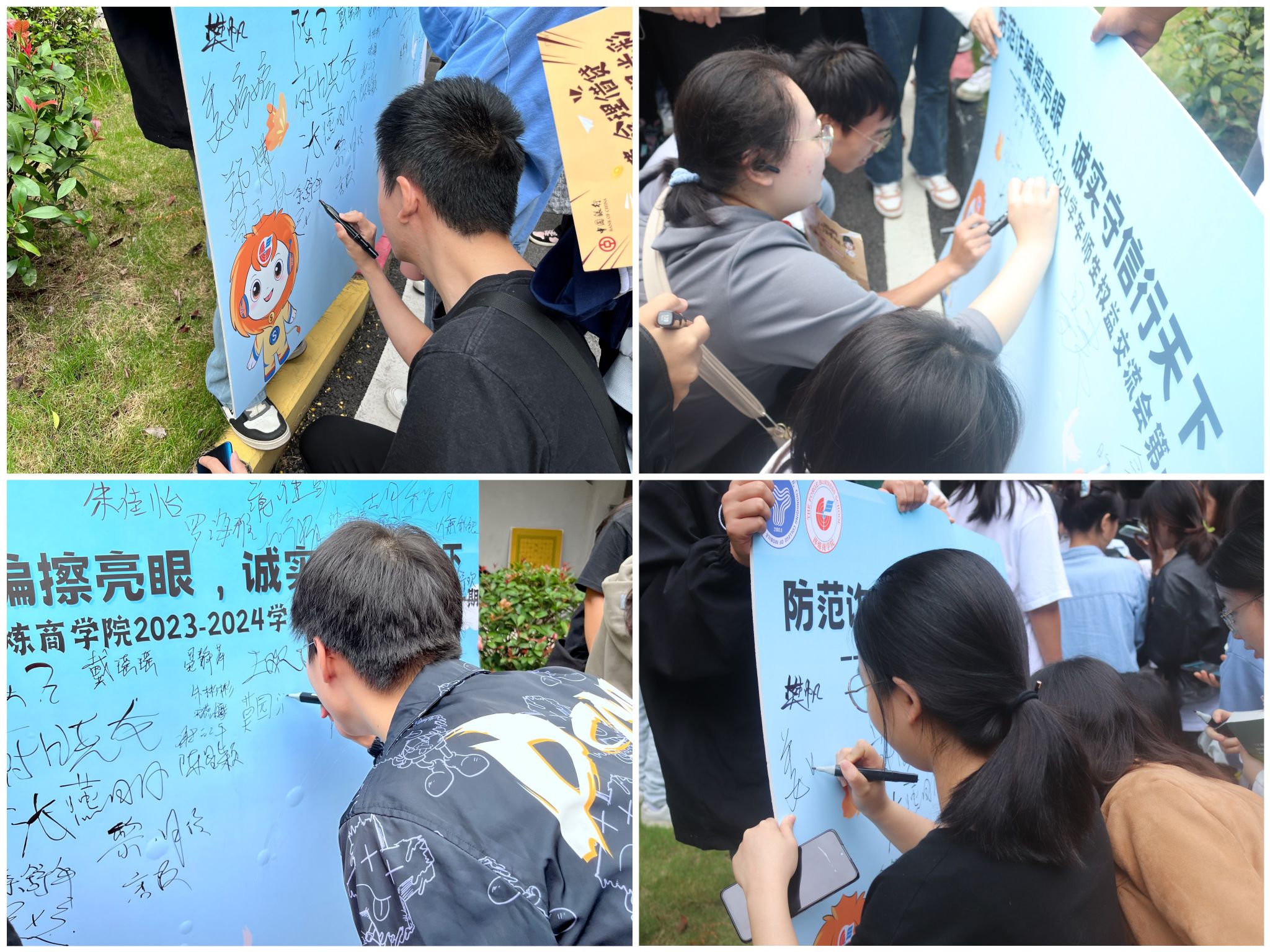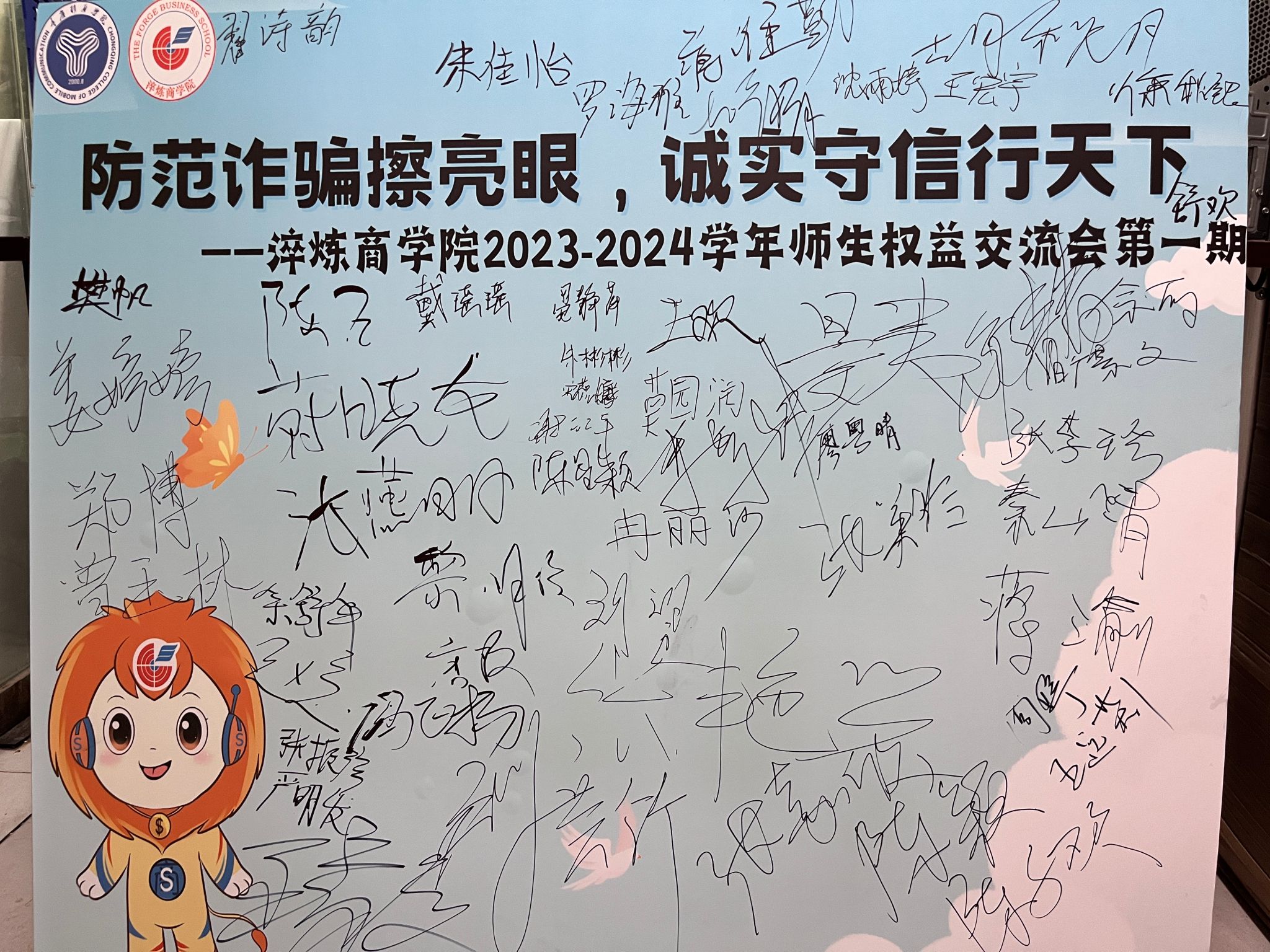 本次师生权益交流会为淬炼商学院的师生搭建了一个学习反诈和征信相关知识的平台,也为淬炼商学院的学子们提供了一个提供一个不仅理论深入,而且实践丰富的学习环境。增强了淬炼学子的反诈意识及防骗意识。活动尾声,同学们和老师进行了KT板签字和合影留念,相信每一位在KT板上留下姓名的同学在日后的生活中都能够提高警惕,绷紧防范之弦,远离诈骗危害。