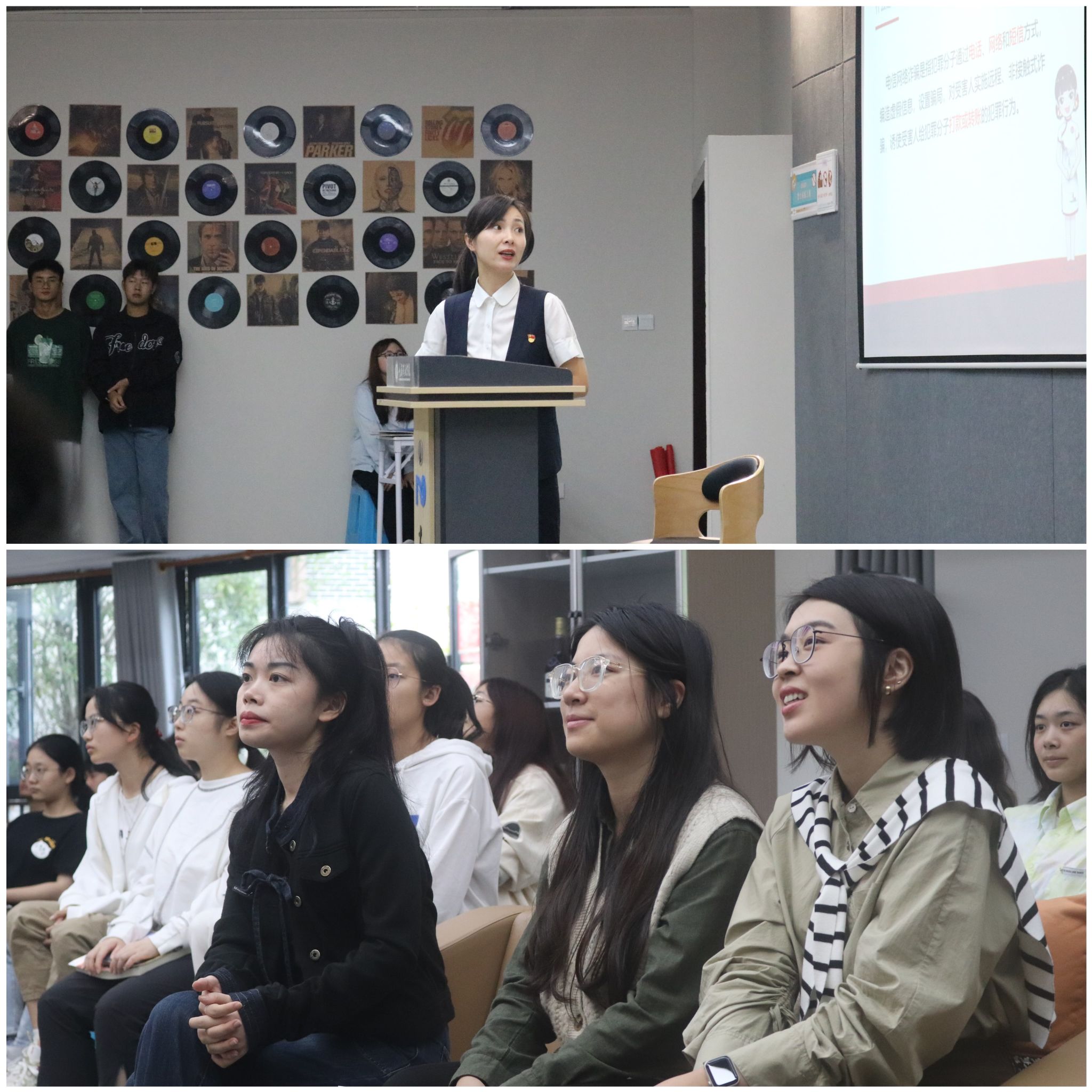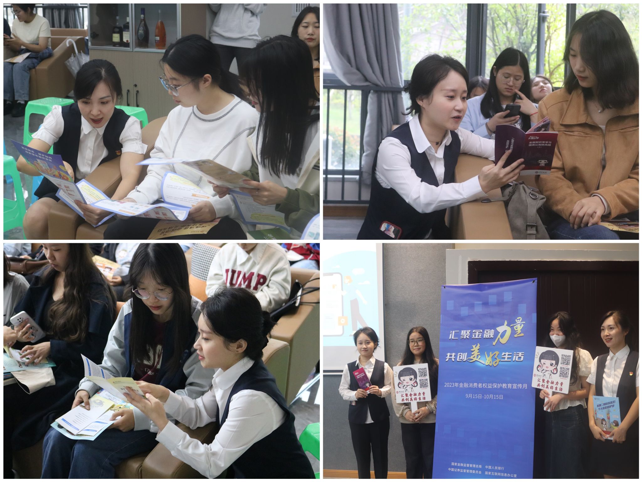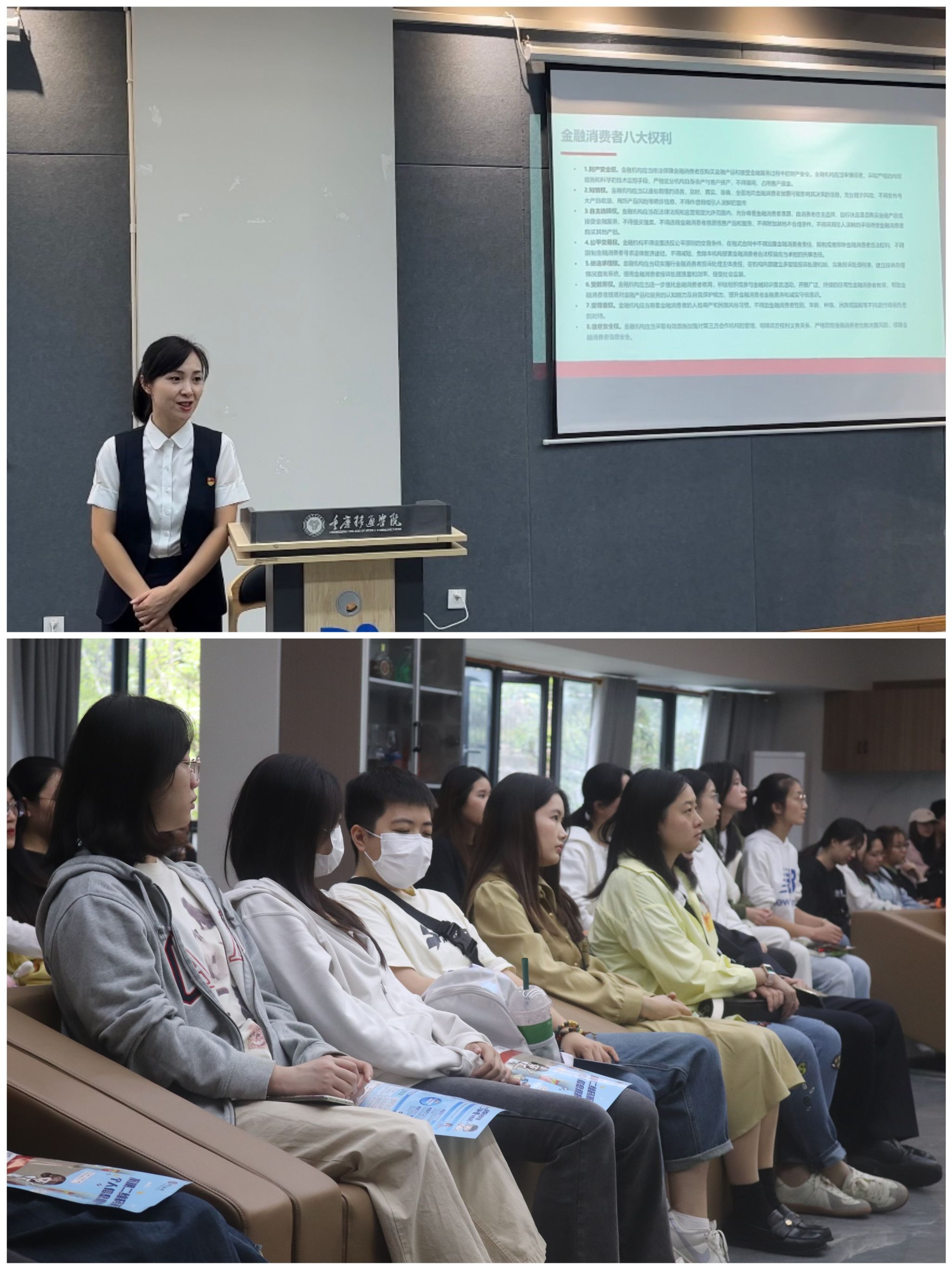 活动候场时,中国银行合川支行的工作人员们邀请在场的同学们拿出手机扫码完成“反诈测试题”,并利用其带来的与金融、反诈、征信知识相关的传单,向答题结束的同学们宣传金融、反诈与征信的一些小常识,对于同学们的一些小疑问也耐心地做出专业的回答。了解到“金融”是商院学子最重要学科之一,也是商院学子最关注的学科之一后,中国银行合川支行综合管理部主任林小平便向活动现场的同学们普及了金融消费者八大权力,特别指出这些权益为金融消费者提供了法律保障,保护消费者在金融消费中的合法权益。
