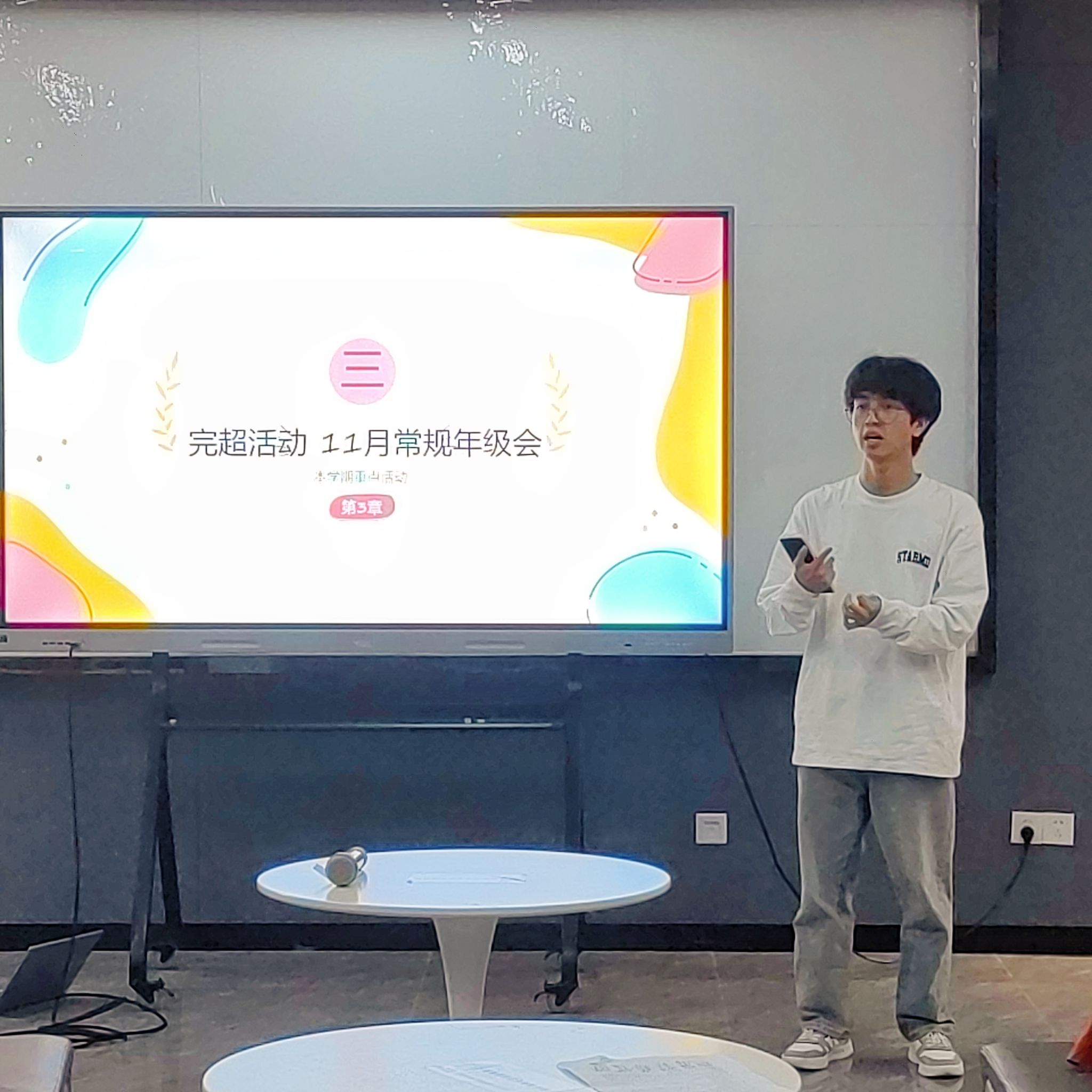班会伊始由黄佳怡为班上同学们细心讲解2022-2023学年总结、2023-2024学年规划以及本学期重点工作。主要围绕着学习、考勤两方面进行大一学年总结,并重温大一所获的班级合照大赛二等奖等等各种奖项以及“完超”活动也取得到不错的反响,看着大家认真听讲的模样,相信在未来的学年里,同学们能够更加努力学习,再创佳绩!完超活动、11月常规年纪会是本班本学期重点活动,对此同学们认真听讲、积极配合、主动分配工作!相信同学们会收获成长与蜕变,班级凝聚力也会得到更加的增强!
