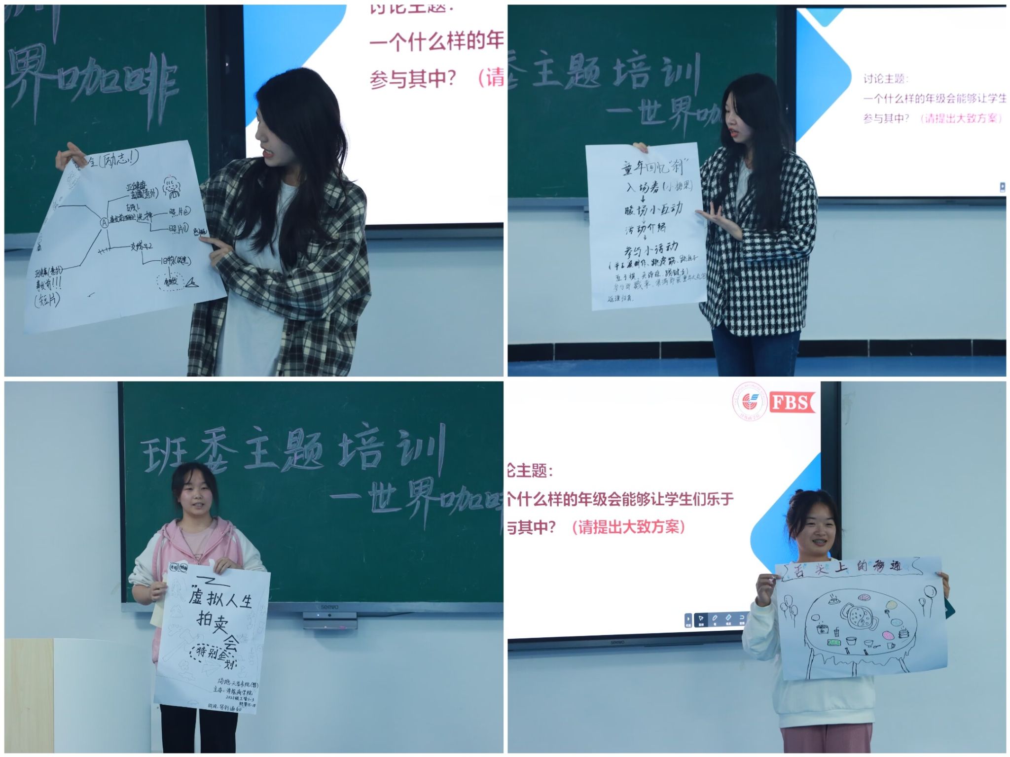 众人拾柴火焰高。学生们如何举办年级会为目标导向,通过团体智慧扎根学生所需、学生兴趣、学生发展以养成与习惯为主体,细化以感恩励志教育、职业规划教育、消费习惯养成、出行安全教育、个人财产保护、艺术实践为活动方向。会议打破刻板印象,灵活生动才是底色。各班委干部愈发彰显创新力、向心力、凝聚力,展现当代大学生的聪明才智和精神风貌。有了思想的碰撞,交流成果也逐步浮出水面。在叶老师的指导建议下,各桌长与组员们力求贡献真知灼见,共同在纸上绘制前期讨论的想法或活动海报,各方案将目的意义融入实际,呈现出富有创造性的方案。