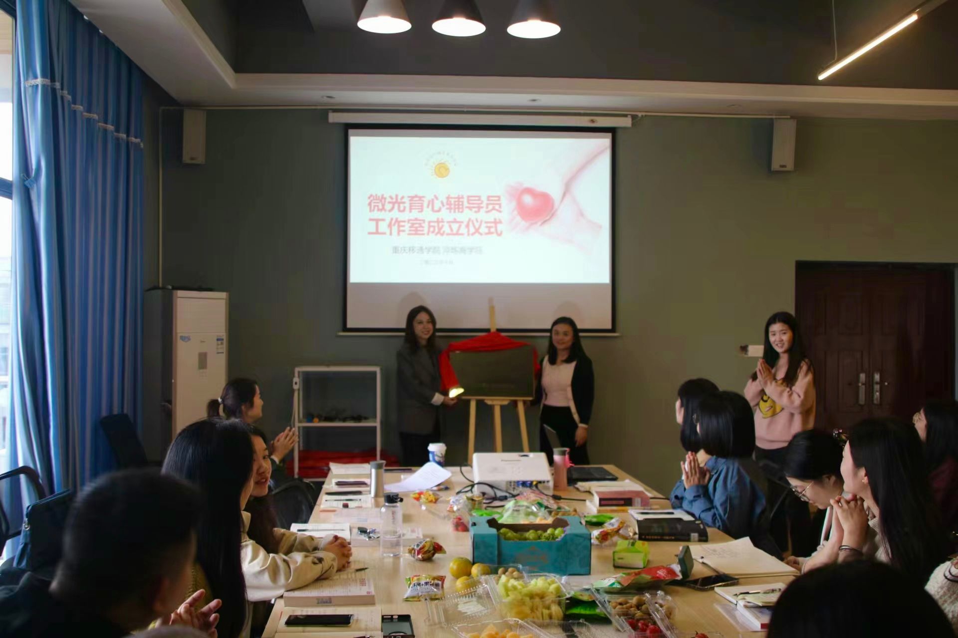 仪式最后,田雨主任和刘薇唯副院长共同揭牌,微光育心辅导员工作室也正式成立。辅导员工作室的成立是提升辅导员开展思想政治教育工作水平的一项新举措,是推进辅导员工作专业化、品牌化的一个新平台,在接下来的工作中,工作室将围绕“立德树人”这一根本任务,不断提升学生工作的育人能力和水平,更好的为学生成长成才服务。