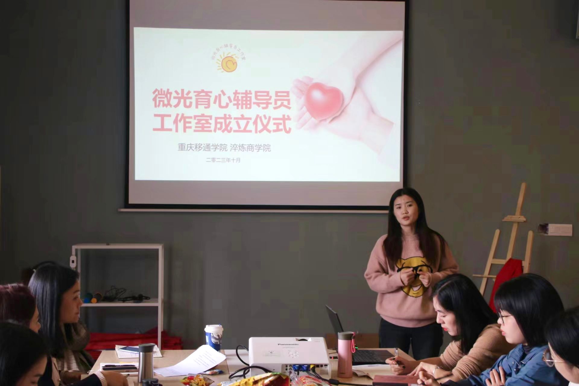 会议伊始,廖进老师作为微光育心辅导员工作室主持人,就工作室成立目的,意义以及工作室的主要成员等进行了介绍,“阳光”心理的支队长陈林伟也对学生支队进行了简单介绍。