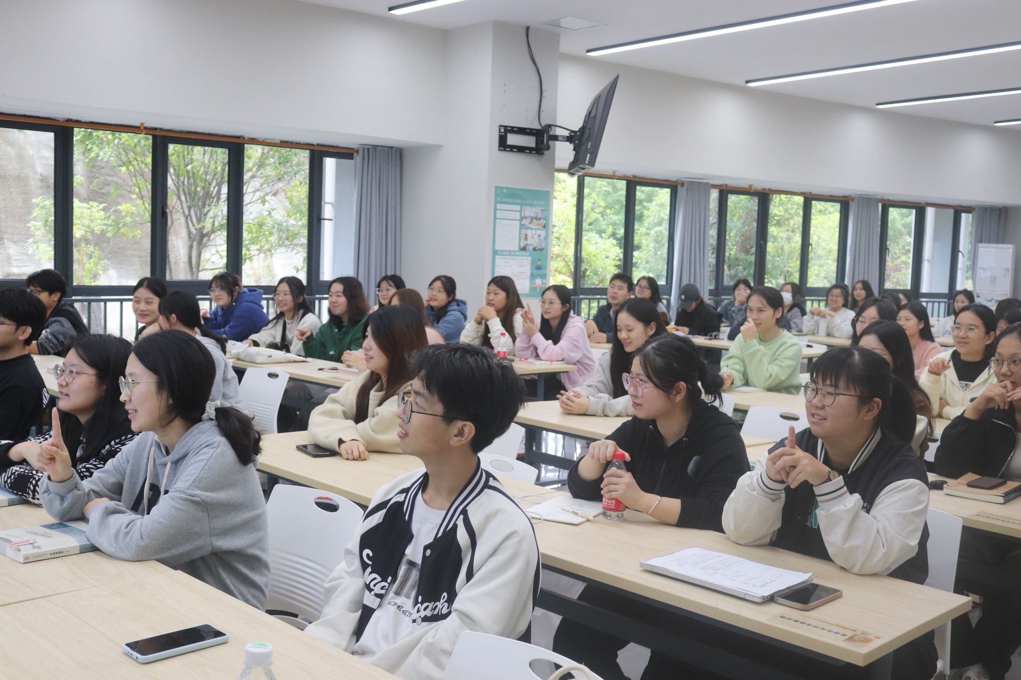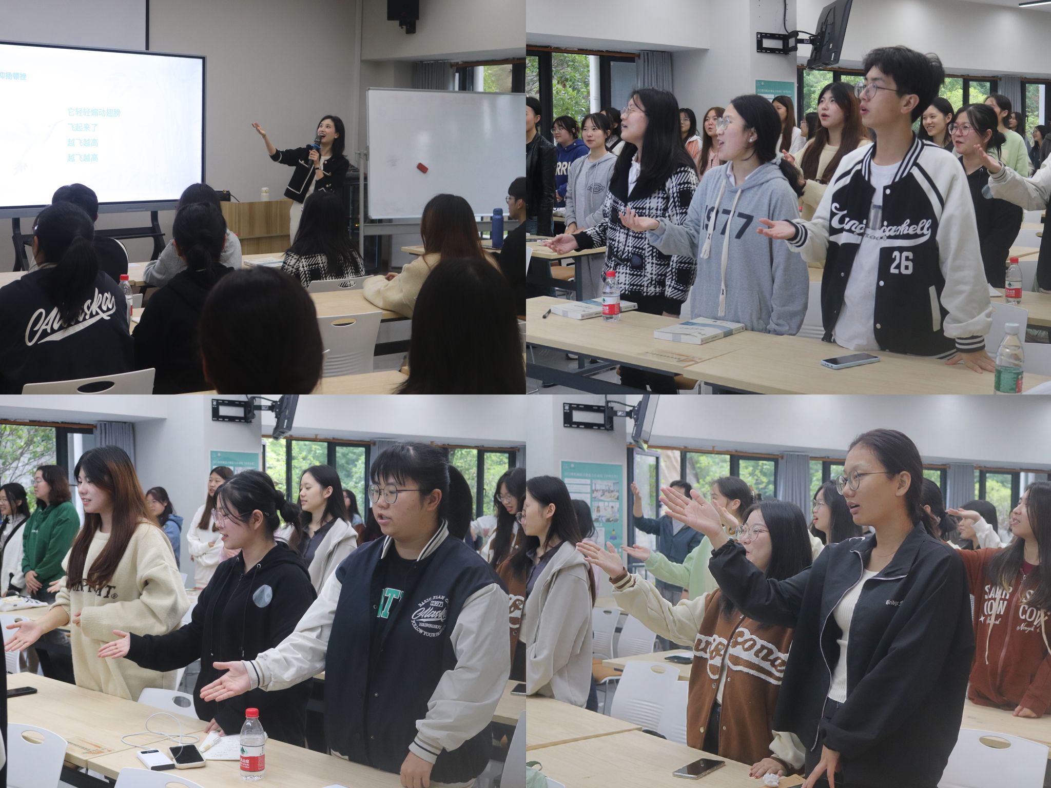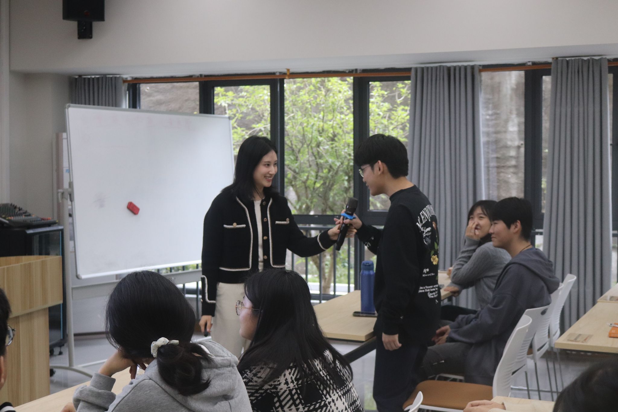 同学们对该如何掌握语言技巧从而来提高语言表达能力提出疑问。邓巧老师表示,可以从四个要素掌握:一是“胆”,要增强自信、敢于接受失败、降低自我关注度;二是“声”,发声练习要打开口腔、吐字归音、气息通畅;三是“情”,要抑扬顿挫,用肢体增强感情和感染力;四是“识”利用思维导图、大纲、卡片来形成完整思路。邓巧老师还提供了实用的方法和技巧,例如调整语气、运用形象化语言。整个讲座氛围活跃且内容丰富。同学们积极参与讨论,在互动中不断探索和提升自己的表达能力。