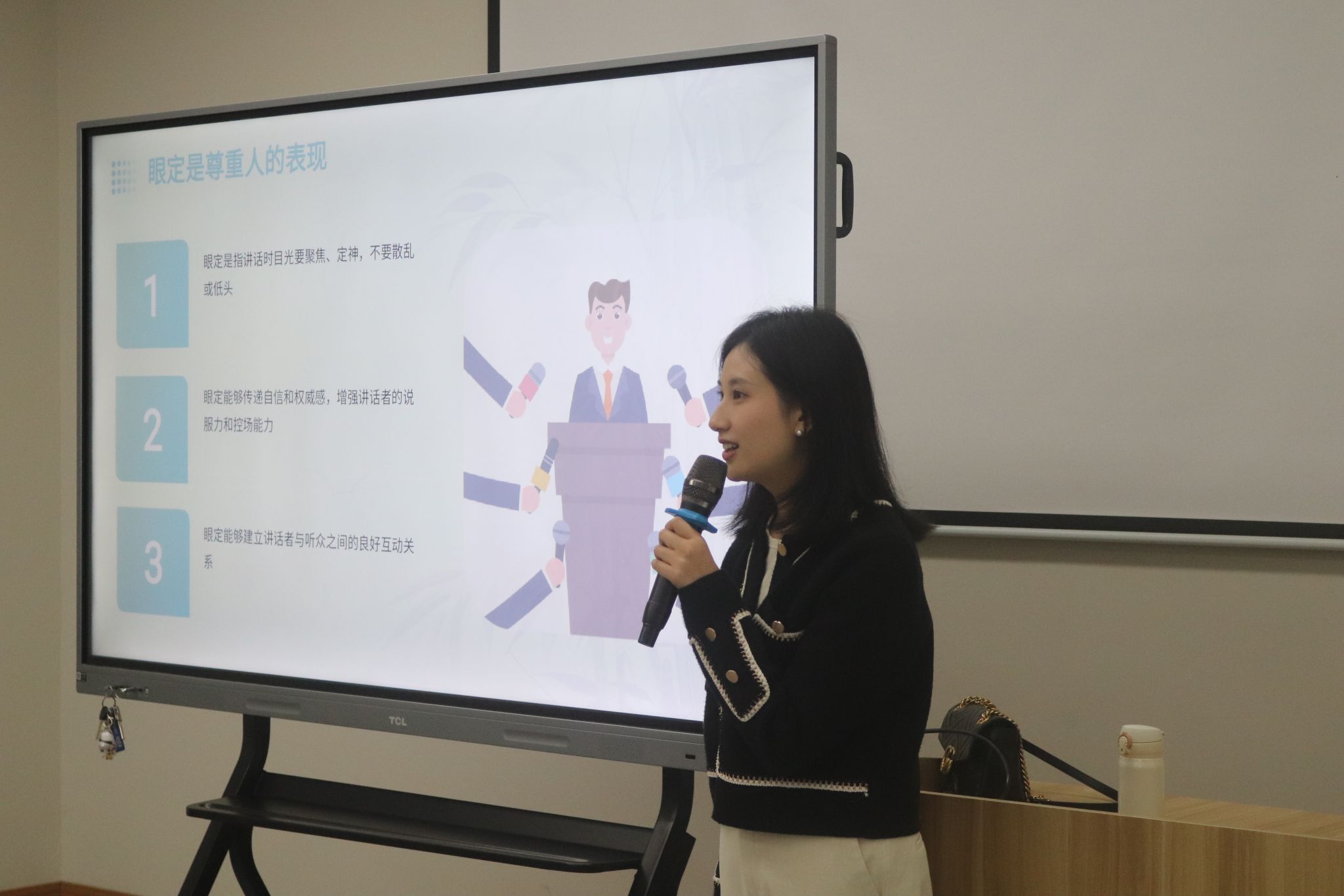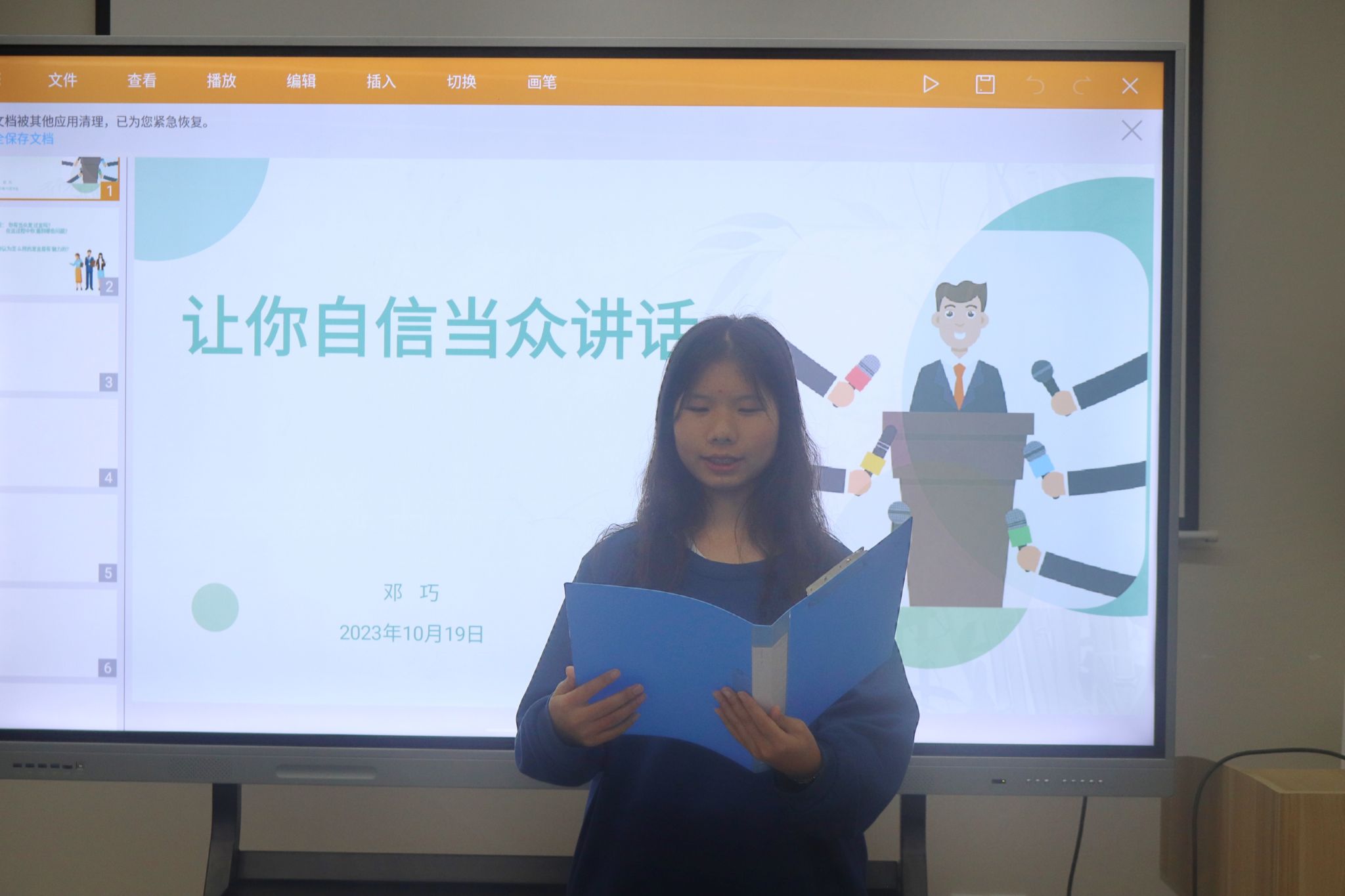 面对大众时,很多人常常因缺乏自信而显得局促不安,表达不清晰,从而影响了信息的传递效果。你认为怎样的发言是有魅力的?面对老师抛出的这一问题,同学们积极讨论,主动表达出自己的想法。邓巧老师通过讲解实例和练习演讲的方式,向学生们传授了宝贵的经验和技巧。熟练掌握人与人之间的交流技巧,可以帮助人们更好地表达自己、传达信息和建立共识,形成良好的交流氛围,解决发言紧张、话题跳跃等问题。