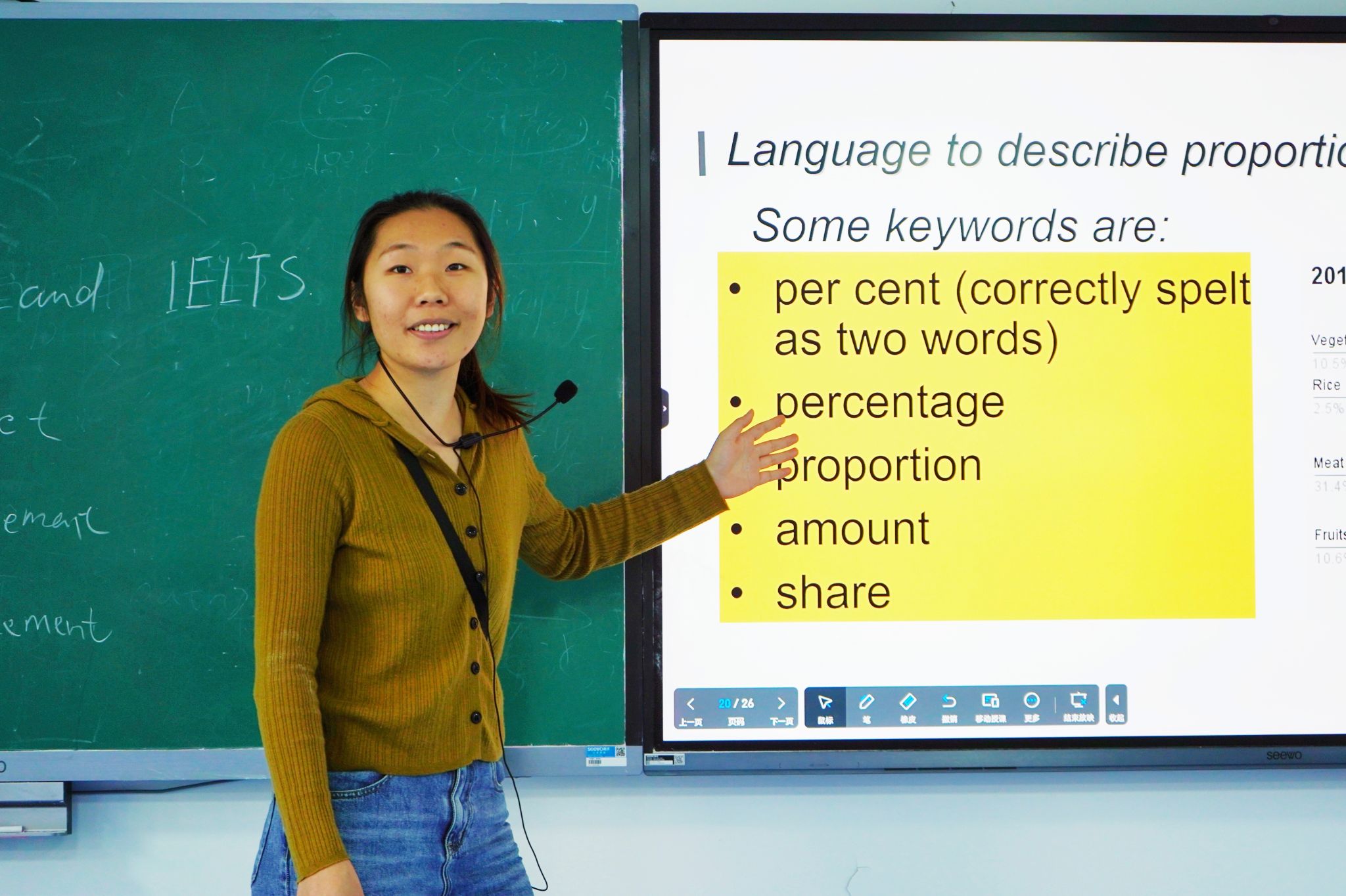 雅思基础课程的教师苏福颃则从英语学术角度为学生提供了重要的技能。她介绍了数字以及其变化趋势的英文表达方式,帮助学生更好地理解和使用英语来表达财务数据和统计信息。更重要的是,学生们学习了如何将调查数据结果进行报告输出。这项技能对于未来的学术和职业发展至关重要,因为学生们需要能够清晰、准确地呈现他们的研究和数据。