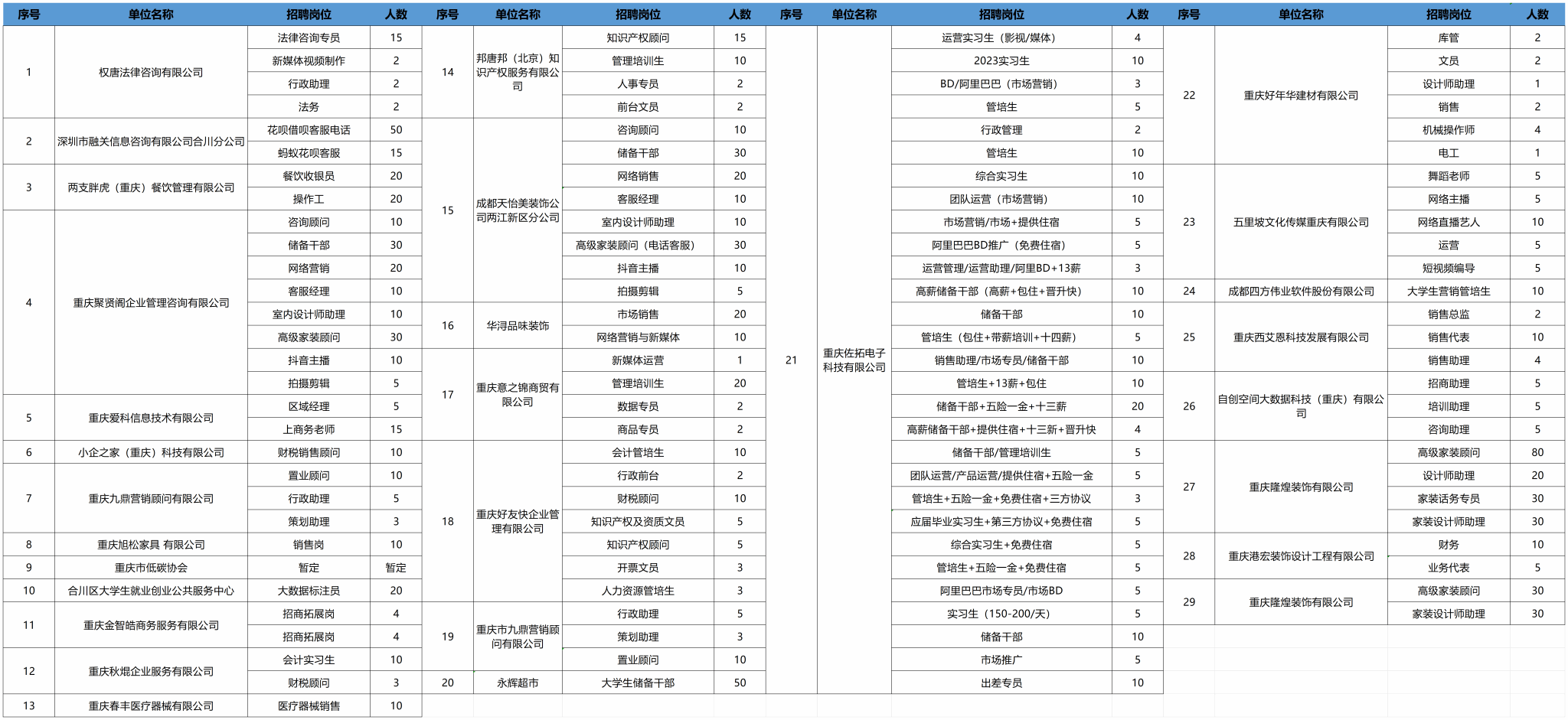 为了给毕业生和用人单位搭建更好的交流平台,更好的促进我校2024届毕业生顺利就业,学校定于2023年10月25日9:00-12:00在重庆移通学院合川校区南湖书院举办“揽天下英杰·赴锦绣前程”——淬炼商学院2024届秋季双选会管理类专场,届时将邀请多家用人单位莅临我校招聘英才,提供丰富的岗位供学生选择,人才需求覆盖多个行业。欢迎广大应届毕业生积极关注,踊跃参加。