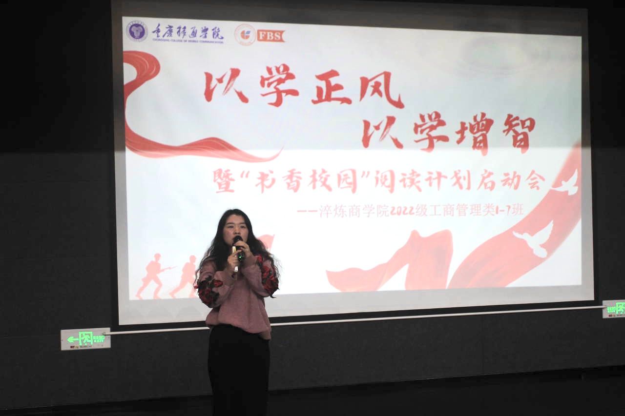 为营造良好的阅读学习氛围,帮助同学们掌握正确的学习方法,更好地学习专业知识,提高自身的竞争力,引导同学们积极参与“书香校园”系列活动、鼓励同学们投身阅读实践。淬炼商学院2022级工商管理类1-7班于2023年10月23日19:00在大学生发展中心·六度空间黑匣子剧场举办了“以学正风,以学增智”主题年级会暨书香校园阅读启动会,本次会议由辅导员杨伦芳老师主讲。