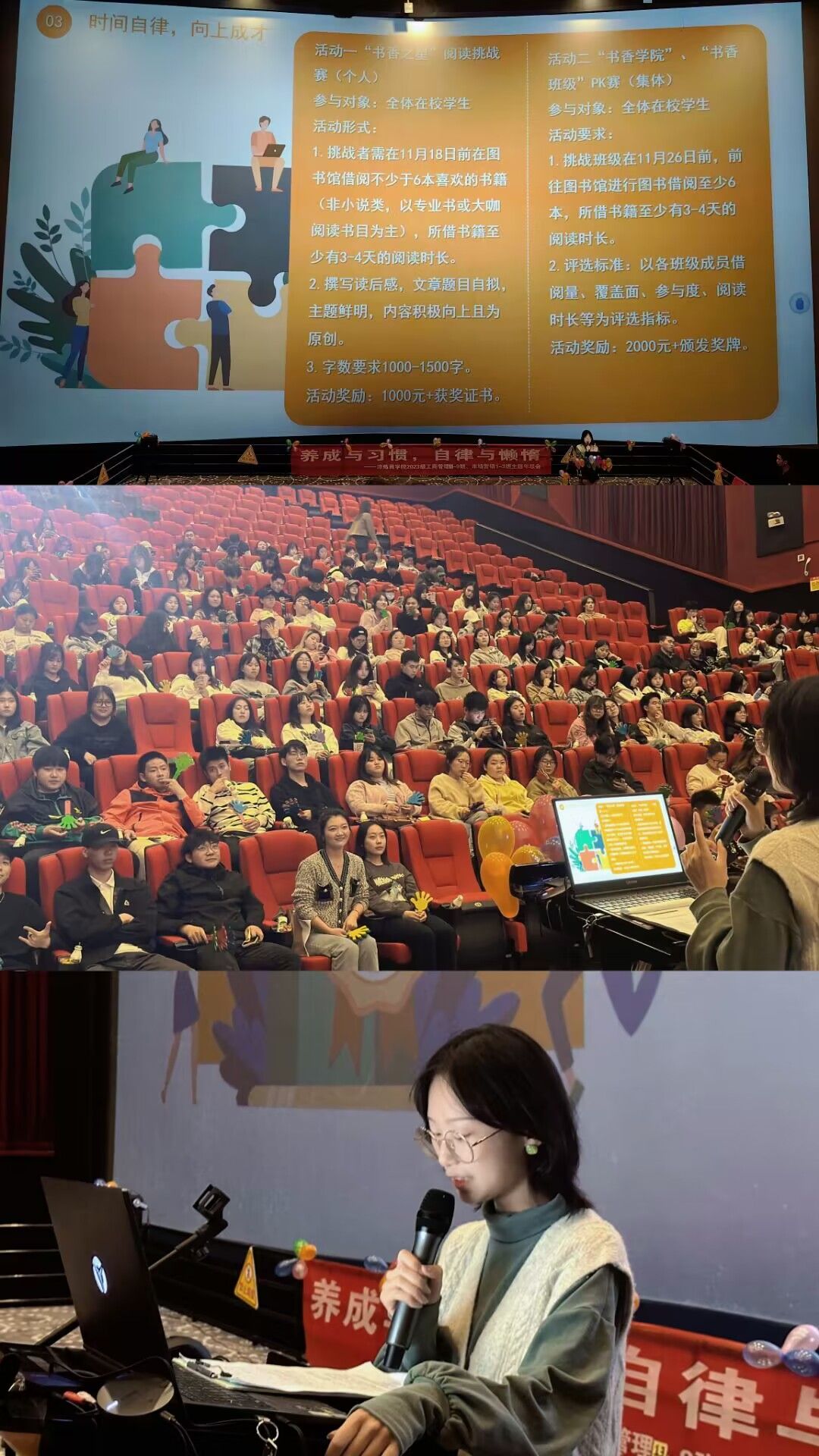 年级长胡娟以“时间自律,向上成才”为出发点,以“小德川流,大德敦厚”为启发点,指出在阅读中要精其选、解其言、知其意、明其理。同时,胡娟强调我们都需要在时间长河里向上成才,当才华还撑不起梦想时,那就静下来享受阅读。阅读是先“厚”后“薄”的过程,即结合兴趣志向,广闻博览为“厚”,将阅读所积累的知识融会贯通为“薄”。最后,胡娟同学还向大家讲解了本次阅读计划活动的细则和要求,鼓励大家积极参与,展现班级凝聚力。