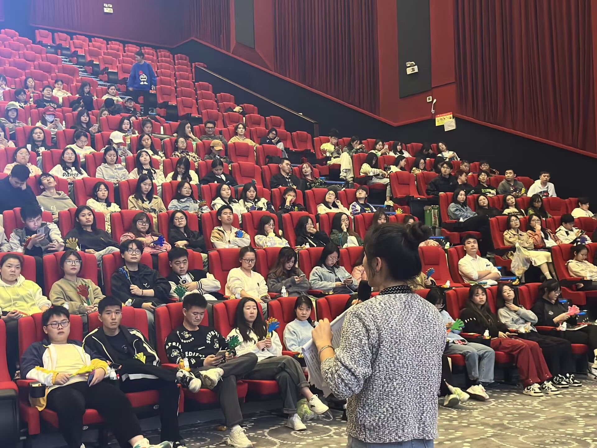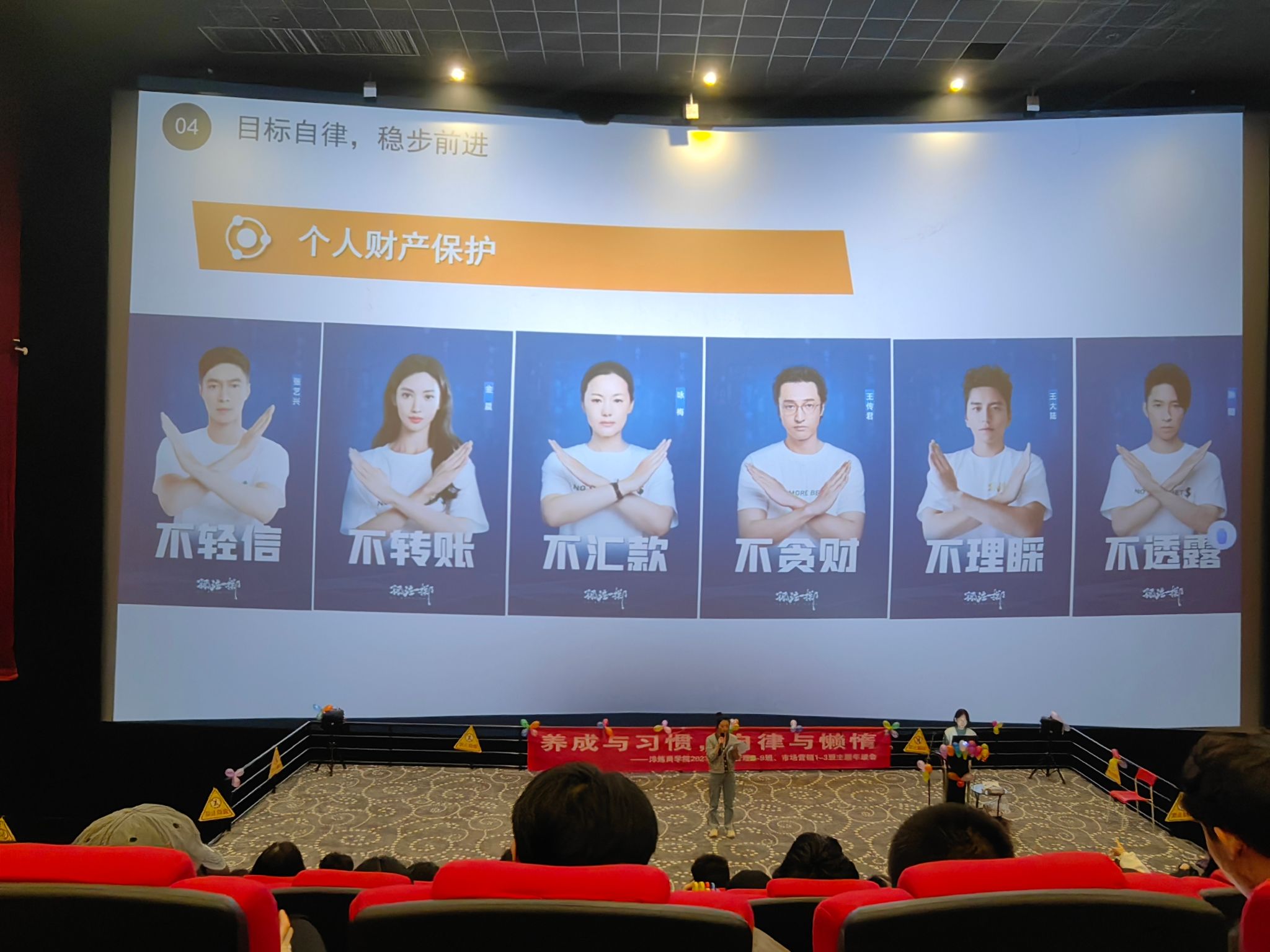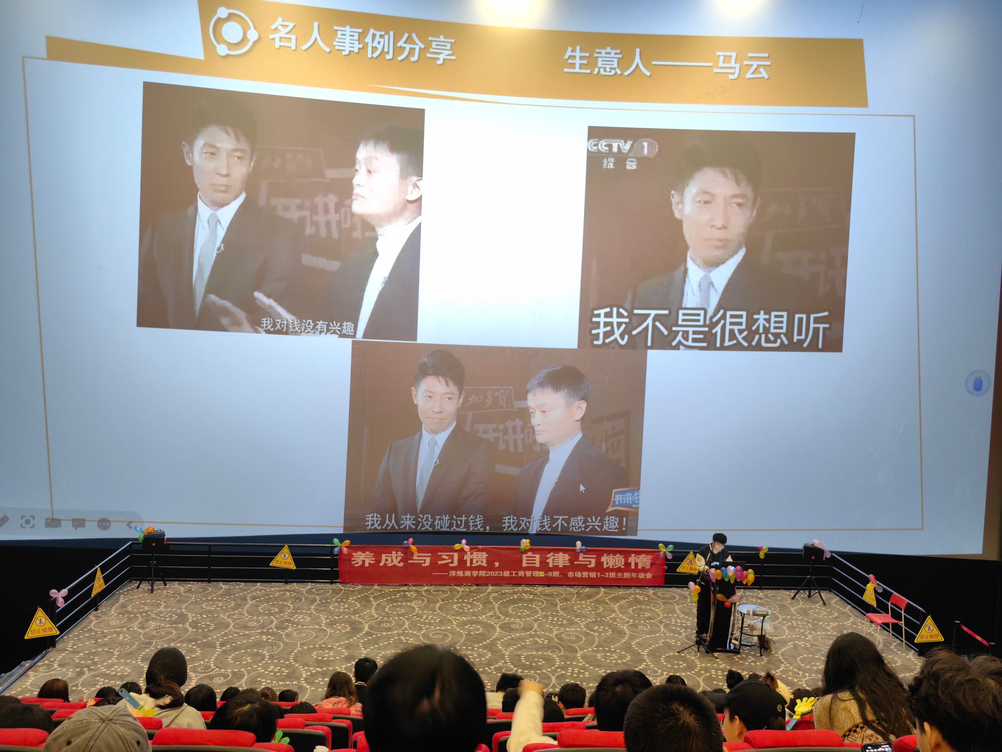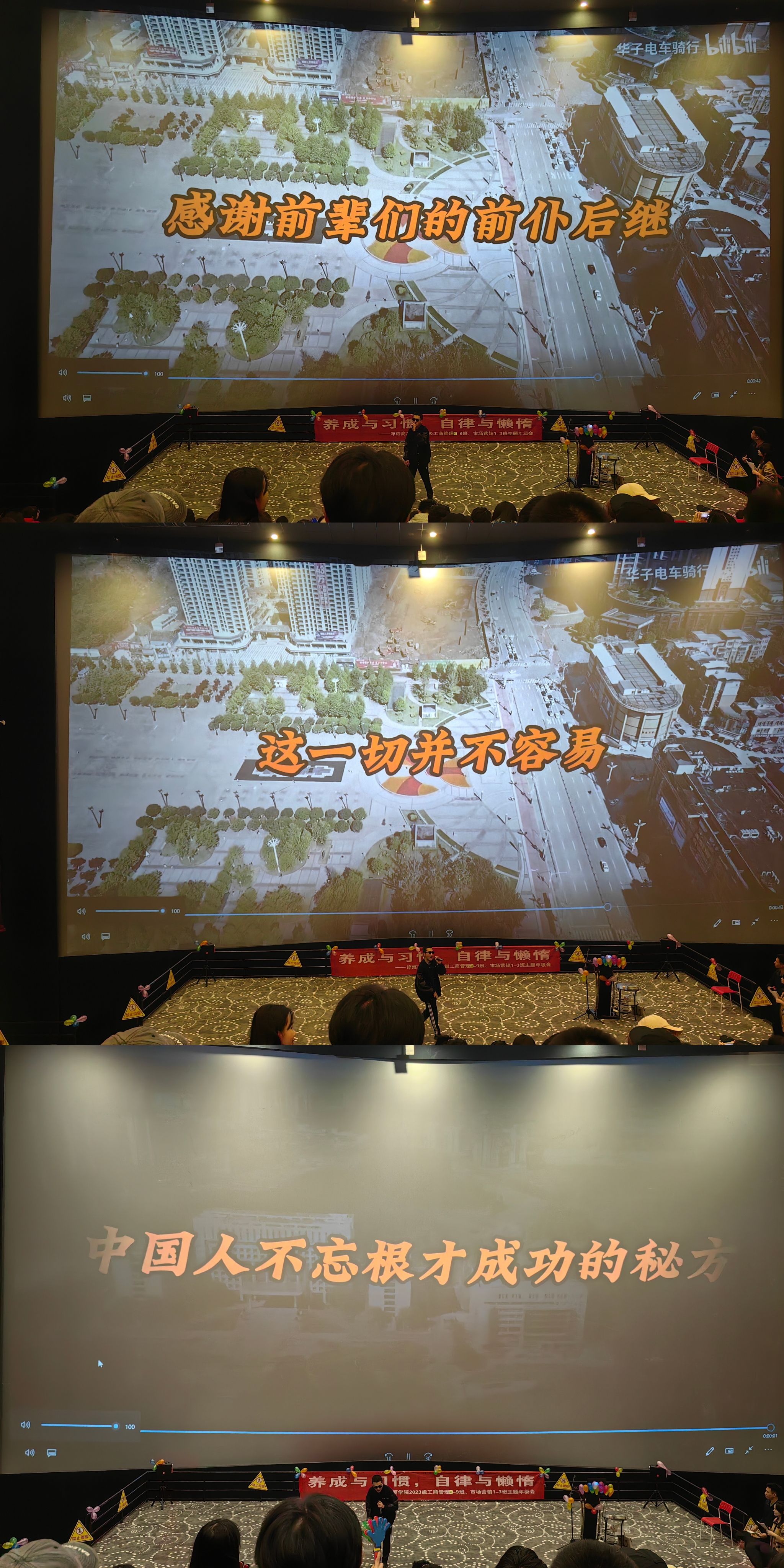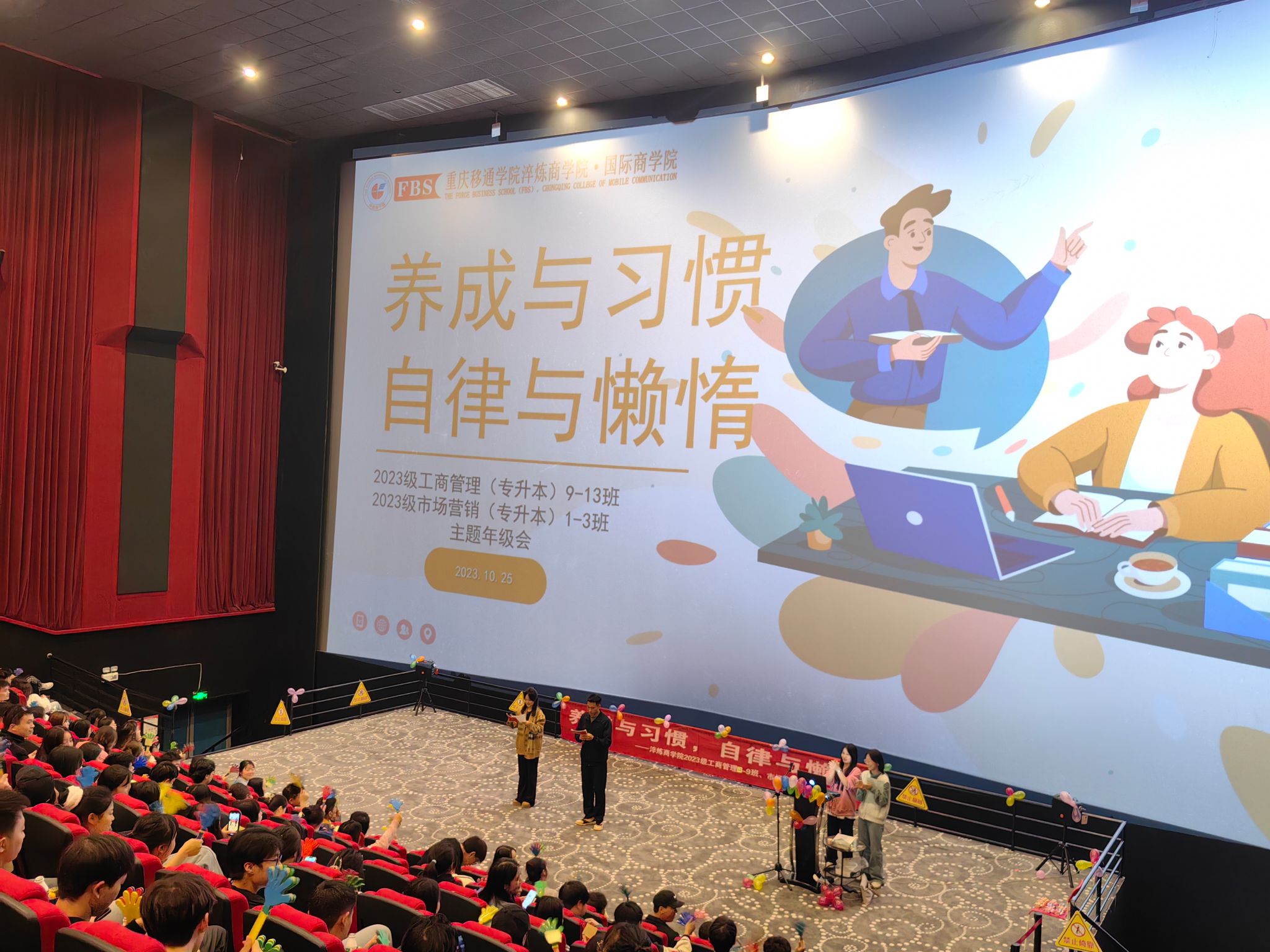 、自律,是成功的密码,要做到自律是极其困难的。能够自律的人,往往是潜在的成功人士。为帮助同学们学会养成自律与习惯,提高自律能力,加强品质修养,2023级工商管理专升本9-13班、市场营销专升本1-3班全体同学于2023年10月25日下午17:00在万画影城教学厅(X超幕影厅)开展了以“养成与习惯•自律与懒惰”为主题的年级会。伴随着大家共同合唱歌曲《夜空中最亮的星》,活动正式拉开帷幕。