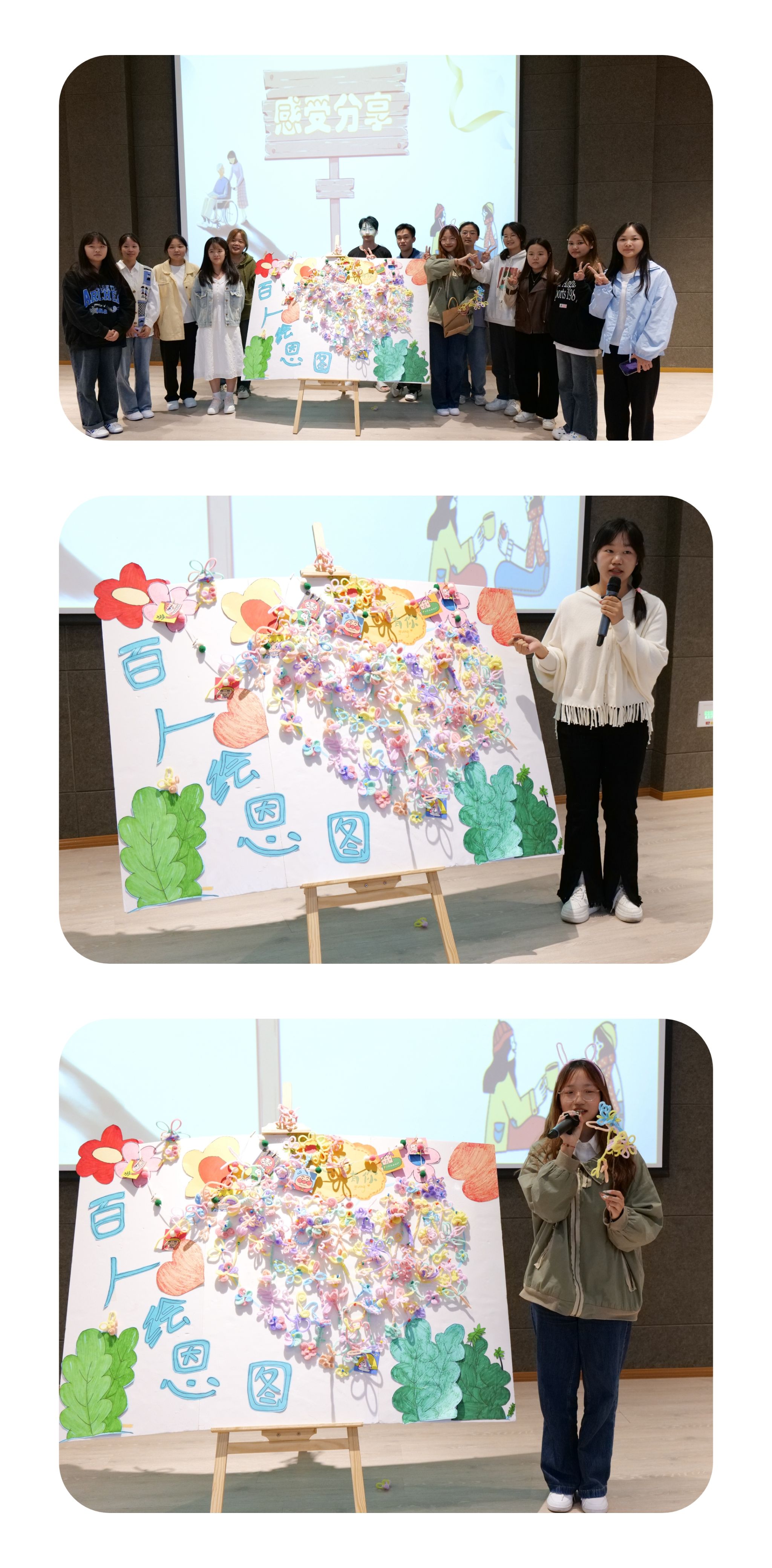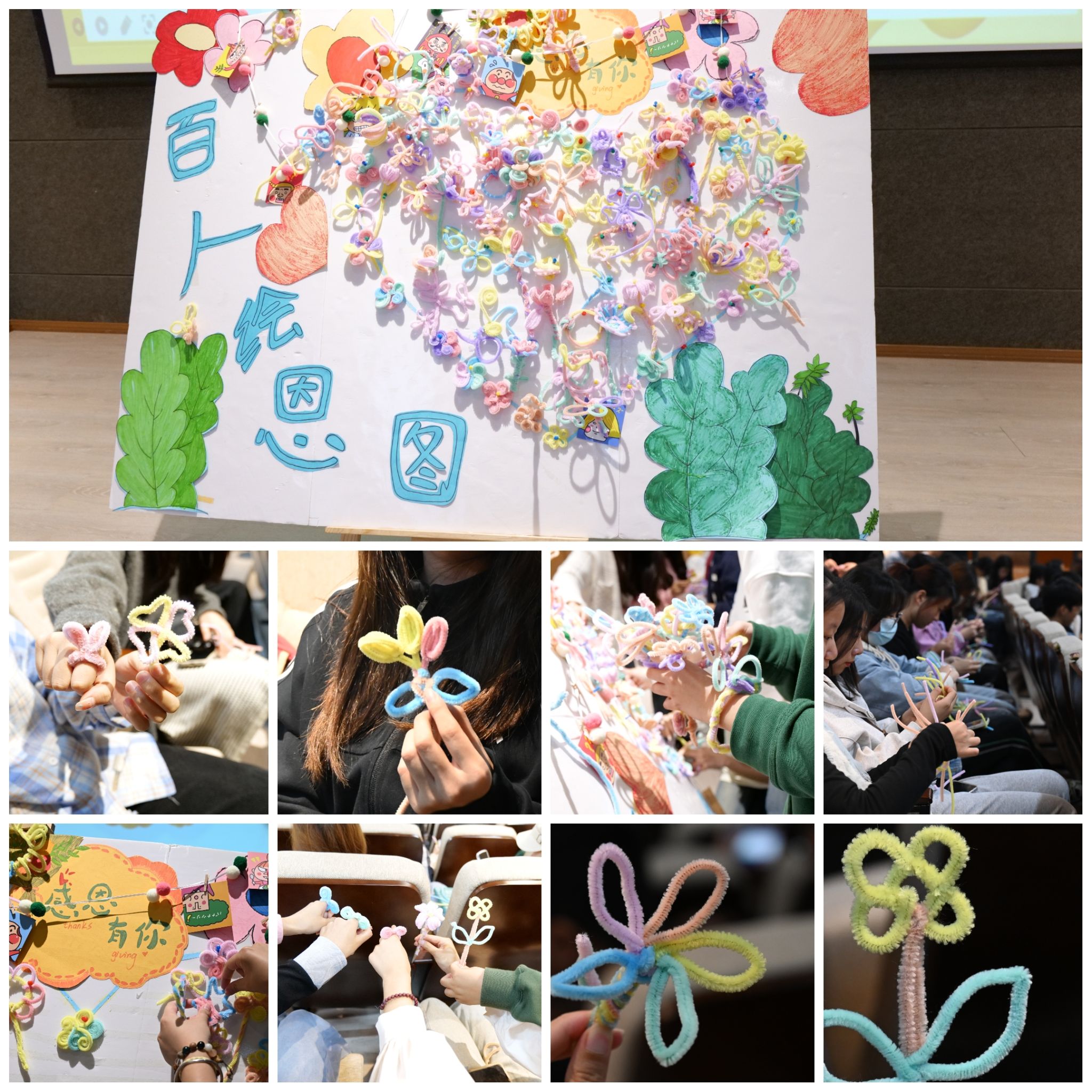 引丹心绘白纸,注真情至心间。一场扭扭棒大比拼为同学们提供了表达感恩的机会。同学们在音乐所营造的热烈氛围下积极配合,围绕”父母养育恩、师长桃李恩、社会成长恩“三大关键词进行扭扭棒制作,将无形的感恩之情承载于有形的手工作品中。随后,同学们迫不及待地将自己的作品贴在白板上,形成了一副”百人绘恩图“,并且争先恐后的分享创作感受和寓意:“这是心形的,代表着我对老师的感恩之情”、“这是一株康乃馨,象征着关心与感激,我想送给我的母亲,感谢母亲一直以来的慈爱和无私奉献……”同学们的真情表露营造了良好的感恩氛围。此外,在手工制作的过程中,同学们相互交流,相互帮助,也进一步感受到了其成长过程中父母的养育之恩、师长的桃李之恩、朋辈的互助之情,从而使感恩之情内化于心、外化于行。