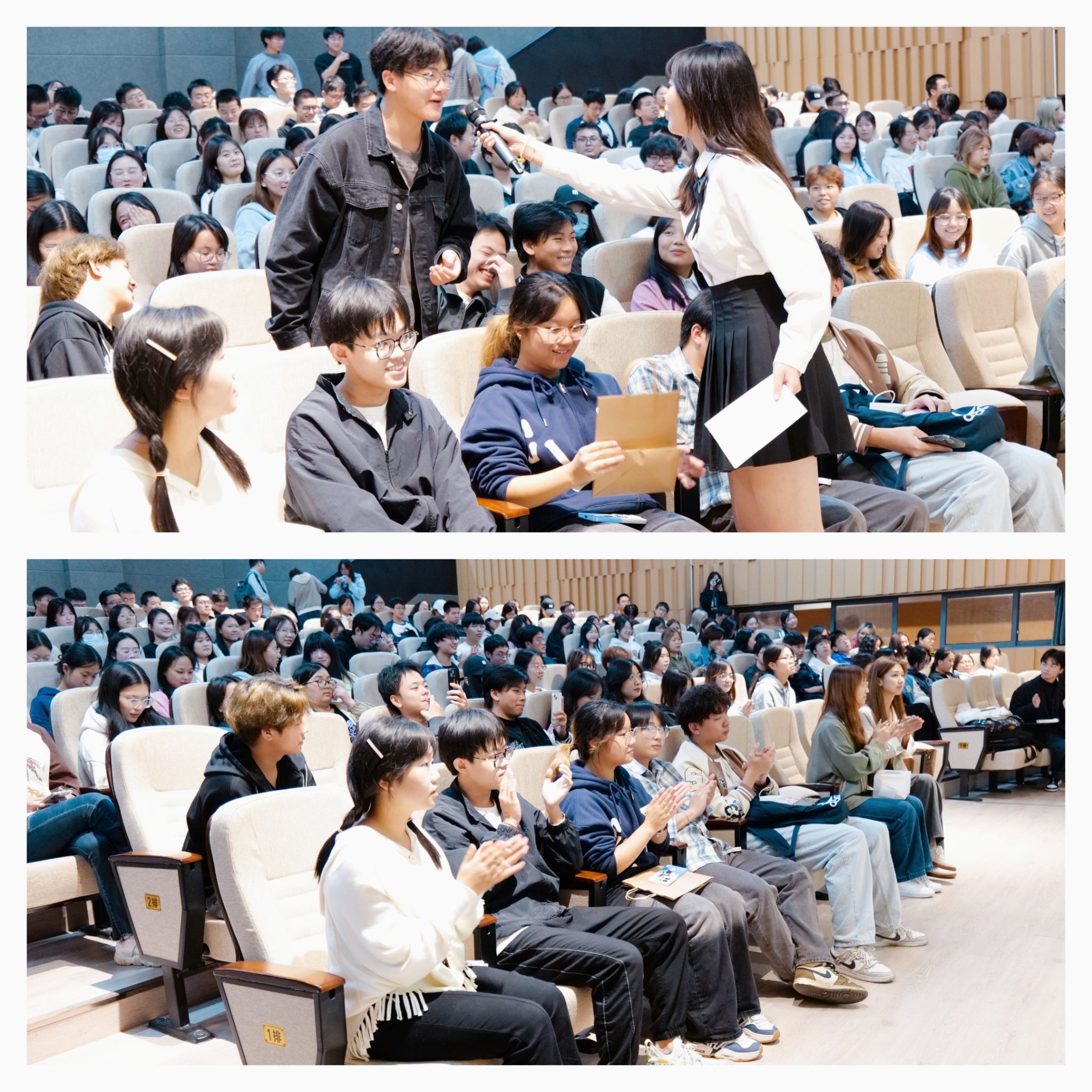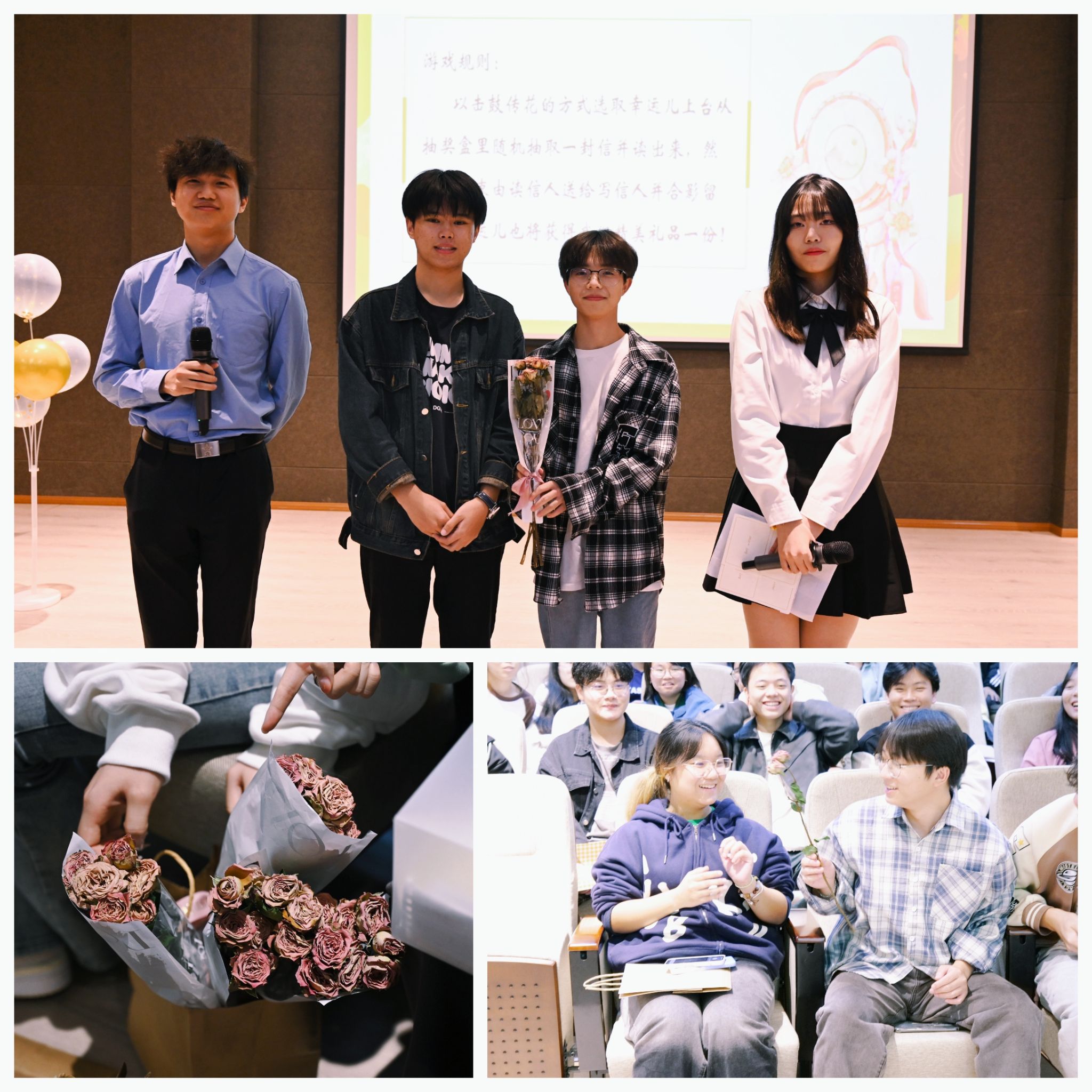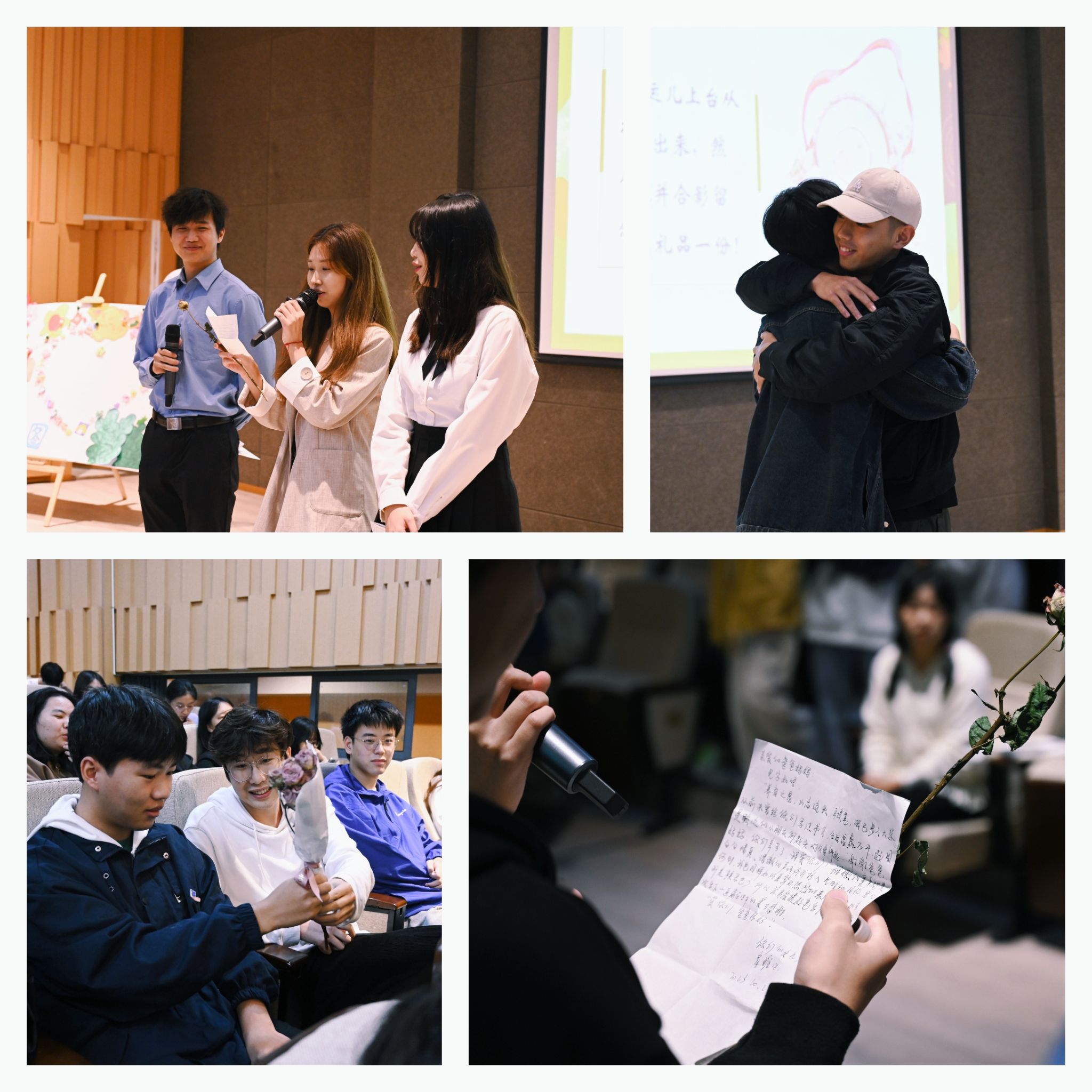 激荡心灵的温暖,传递感恩的力量。在温暖与爱中学会感恩,在感恩他人中学会将感恩化作一种充满爱意的行动并实践于生活。击鼓传花的游戏由此展开,轻快的音乐响起,同学们将鲜花一个又一个传递,音乐停止后,持花者上台抽取感恩之信并深情诵读,“亲爱的爸爸妈妈,进来天气多变,记得添衣……”、“亲爱的朋友,人生海海,有幸相遇,感恩关爱与包容……”,场下的同学被所诵读之信惹红了眼,信里的内容弥足珍贵,感动的情绪激荡人心,在同学们高涨的热情氛围下,持花者将感恩花束送与写信人。通过信与花的交换,难于言表的感恩之情由此传递延续。此环节使同学们学会在生活中发现温暖,勇于表达感恩,懂得将心中的感恩之情付诸行动。