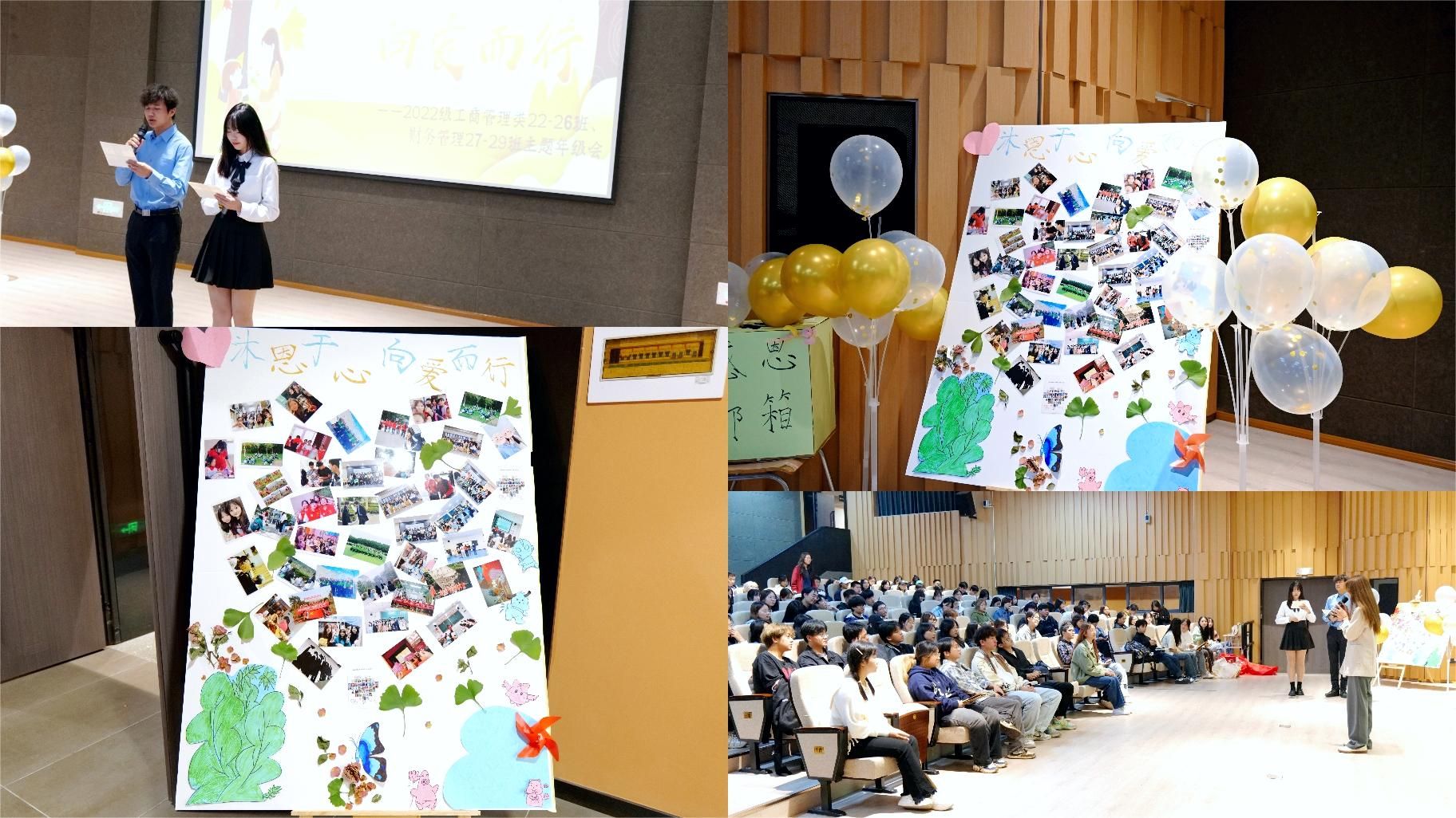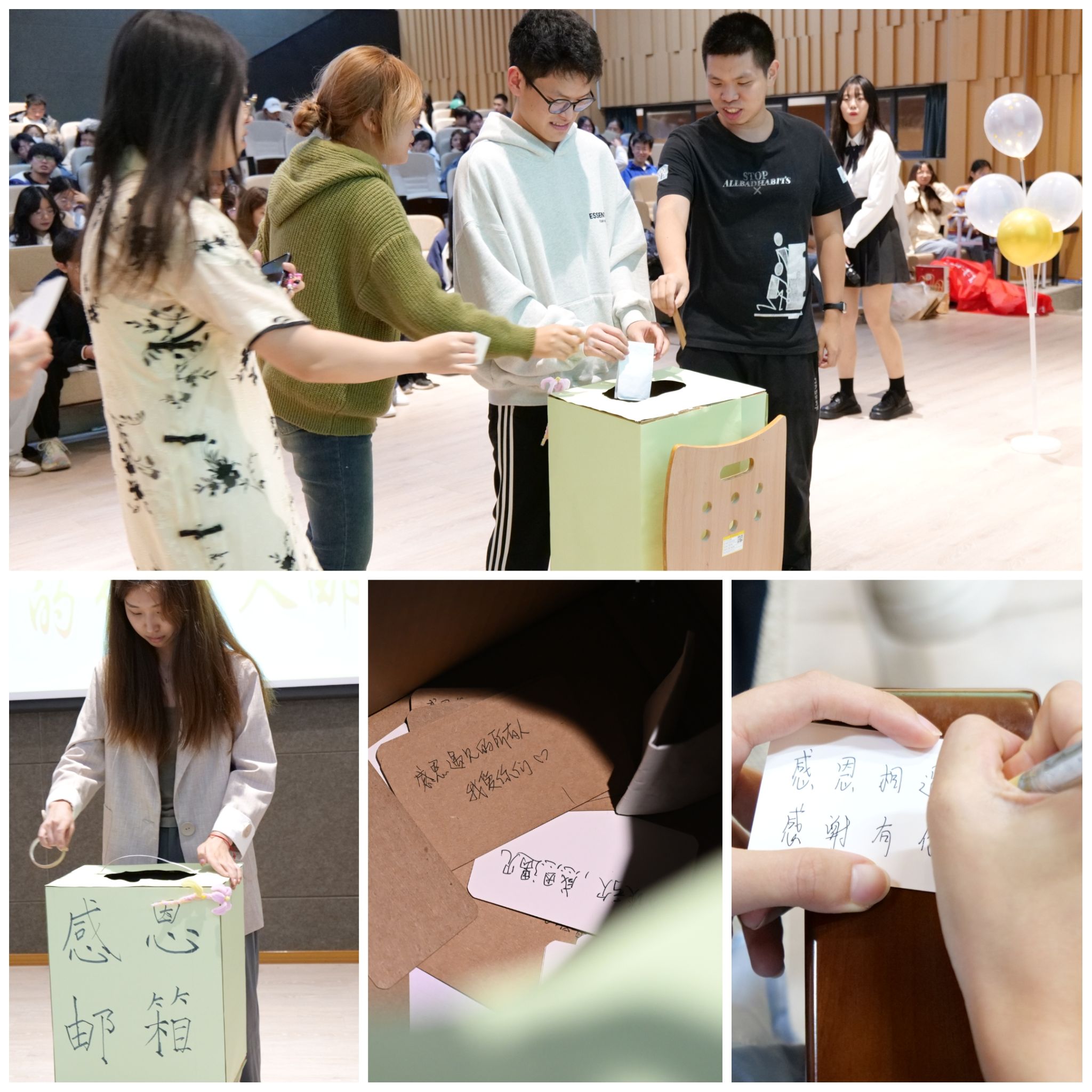 忆昔日笑颜,追前程锦绣。灯光一闪,《小幸运》节奏一起,同学们的生活点滴映入眼帘,大家不由自主地跟着音乐合唱和晃动起来。大家沉浸在歌声里,回忆与父母、与朋友在一起时的温暖时刻,并将自己想说的话写在了小卡片上:“生是恩,养是恩,谢谢爸妈让我衣食无忧,无惧人海”、“一路相伴相随,难得缘分,感谢与你相遇……”一张张充满爱的小卡片相继投进感恩邮箱,投递完成后便邀请辅导员封箱,最终将把其转寄到所感恩之人的手中,此环节使感恩之情无限延续,将感恩之心贯彻始终。随即辅导员唐银桧老师向同学们讲述了自身对于父母、对朋友、对陌生人所给予的温暖而进行回应的事例,以亲身经历引导同学们应树立感恩意识,塑造感恩的良好品质。场下同学们接连点头,表示将弘扬感恩的传统美德,把温情传递给更多的人。