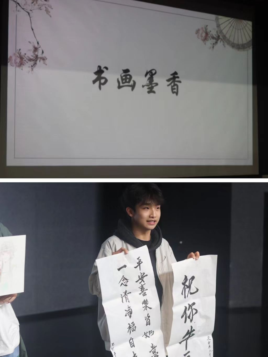 大国底蕴,让人静从心生。一撇一捺,书写汉字之古韵。中国书法文化源远流长,直到今天,我们在面对一件件经典碑帖的时候,依然能够感受那清风万古,明月千江;感受那聚散离合,人生悲欢。书法爱好者曾皓澜同学现场为我们展示了书法作品,纸灯制作小组也为我们带来了美妙绝伦的纸灯作品,现场同学都为之惊叹。我们相信,中国的优秀传统文化,一笔一画,一动一静,既能绘出曾经的大江奔流,也必然能写出今天的大地迎春。最后,辅导员罗藝老师来到台上做总结,她说到:重视中华传统优秀文化要靠大家一起努力,要将文化与生活紧密的结合起来,同时也倡导同学们在课余时间多去参与关于传统文化的活动,去感受更纯粹的文化内涵及文化之美!