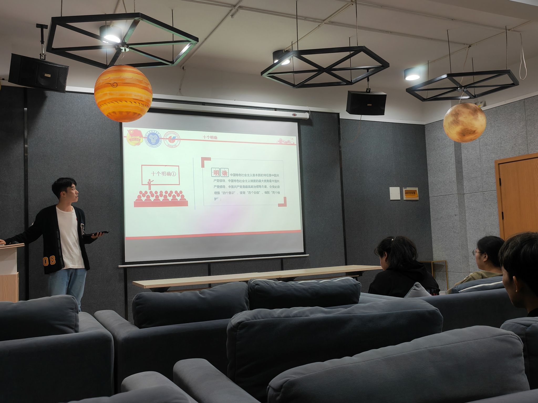 真理之光照亮理想之路,青年一代坚定远大理想离不开科学理论的指引。活动伊始,组宣委员朱泓桥围绕“两个结合”、“六个必须坚持”、“十个明确”和“十四个坚持”等习近平新时代中国特色社会主义思想,引导团支部成员不断增强对党创新理论的政治认同、思想认同、理论认同及精神认同,让大家对党的新思想有了更深刻的认识,也更加明确了自身肩负的责任,提高个人政治觉悟和理论修养。同时,对于支部成员把握时代发展趋势以及明确个人的前进方向,具有极其重要的指导意义。