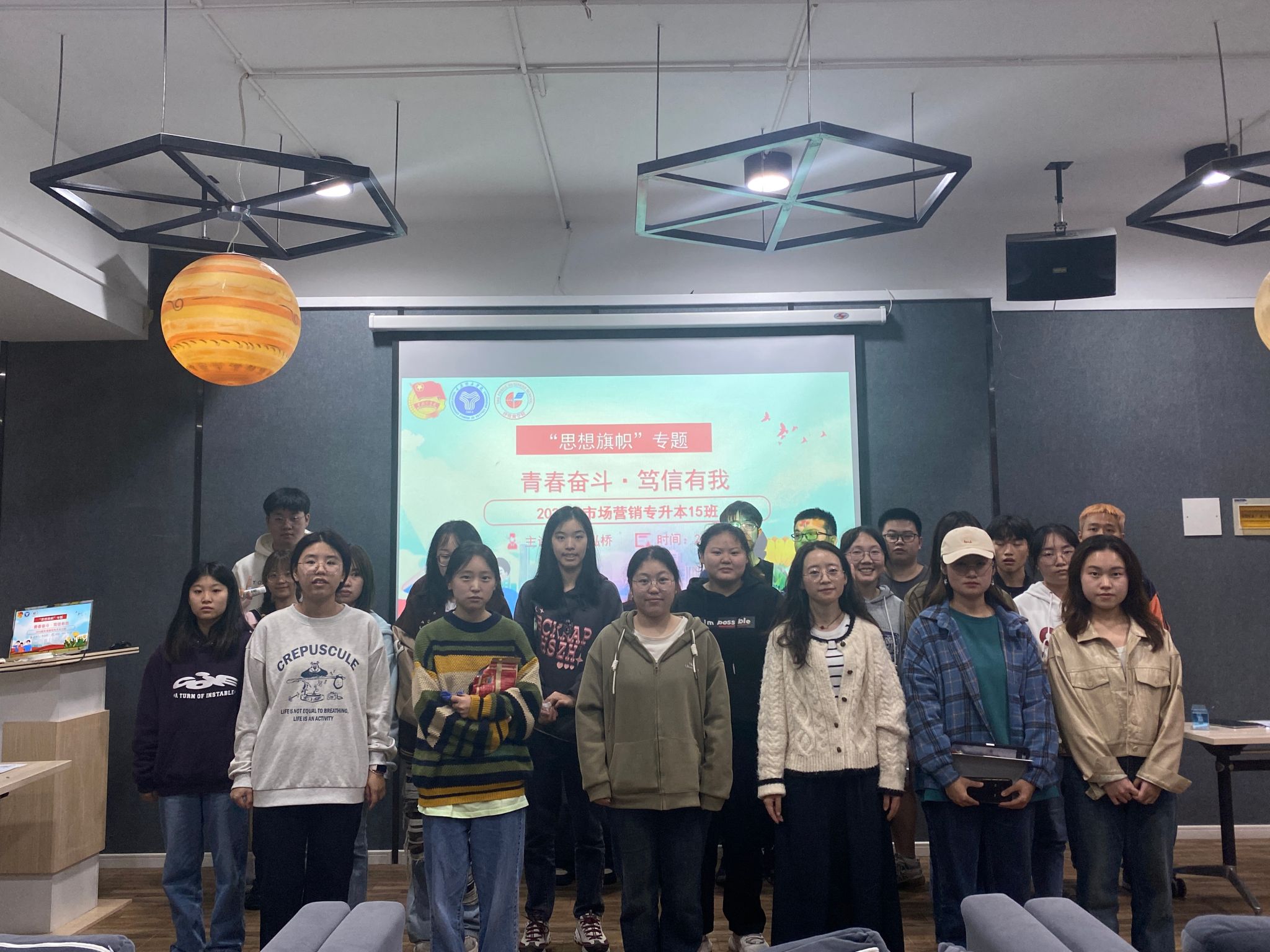 青年一代有理想有本领有担当,国家就有前途,民族就有希望。为深入贯彻落实习近平文化思想和习近平总书记的重要指示精神,焕发青年学子精神新风貌。2023级市场营销专升本15班于2023年10月25日晚上8:00在汇江影音厅开展“扬帆迎风起,思想领航行”主题团会。本次团会活动由15班组宣委员朱泓桥主持,全体支部成员共同参与。