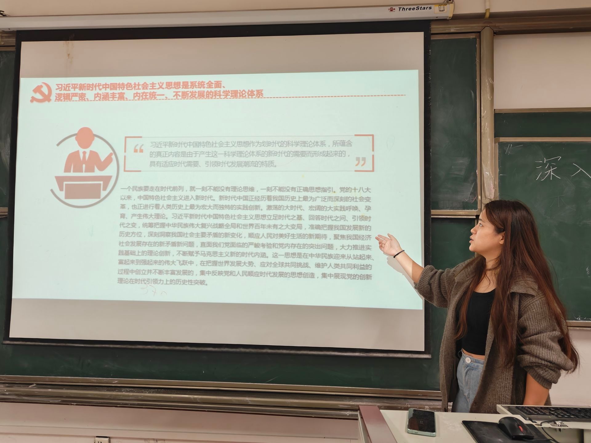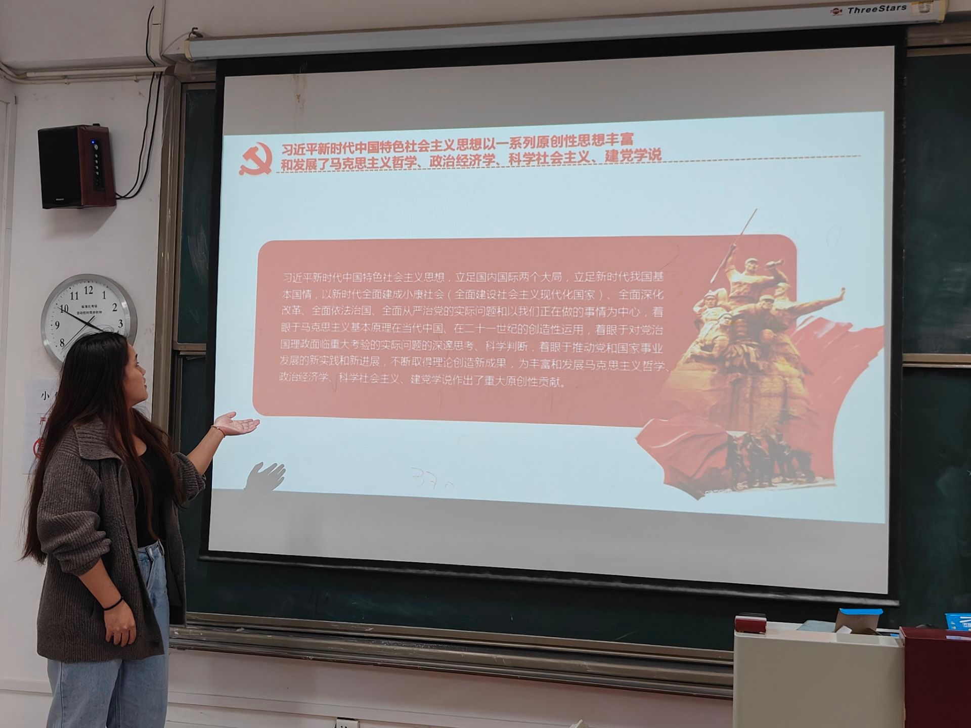 罗同学从马克思主义辩证法入手,从“全面的、系统地、普遍联系的”思想革新角度谈习近平新时代中国特色社会主义思想为马克思主义哲学作出的原创性贡献。同学们更是发言列举绿水青山就是金山银山”真实案例、列举“一带一路”发展带给我们生活上的改变,更显实践到总结再到实践的“新思想”结合时代、引领时代特质。新时代的原创性思想、变革性实践、突破性进展、标志性成果,无不体现着习近平总书记深邃的战略思考,闪耀着习近平新时代中国特色社会主义思想非凡的战略智慧。