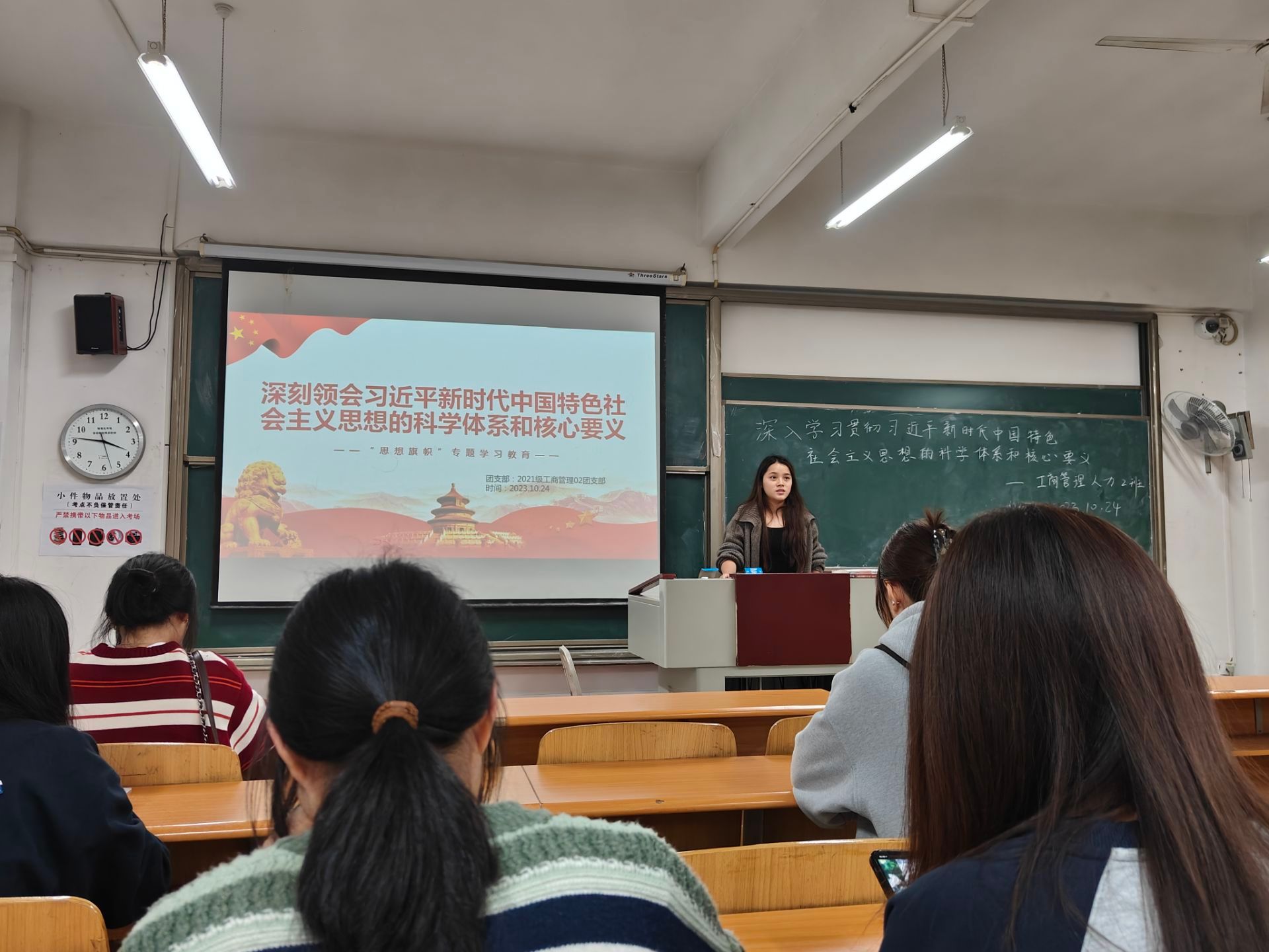 习近平新时代中国特色社会主义是当代中国马克思主义,二十一世纪马克思主义,是中华文化和中国精神的时代精华,实现了马克思主义中国化新的飞跃。为加强班团思想建设,注入青年实践之新动力。淬炼商学院工商管理2班于2023年10月26日在7308开展“思想旗帜”专题学习教育,共计30名同学参与。此次专题学习教育通过学习领悟习近平新时代中国特色社会主义思想的科学体系和核心要义,来高扬伟大思想旗帜,丰富青年的思想素质。