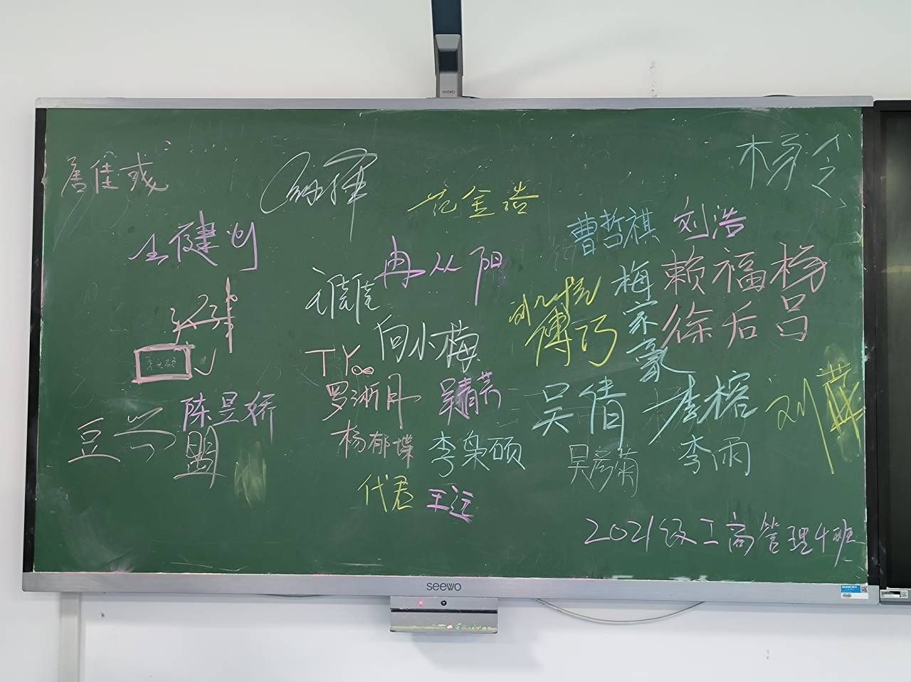 团建的最后,同学们在黑板上留下了自己的名字并合影留念。在黑板上留下名字是一种团结和凝聚的象征,展现出工商管理4班的同学们之间的联系和相互依赖,也展示了团队合作和友谊的力量。