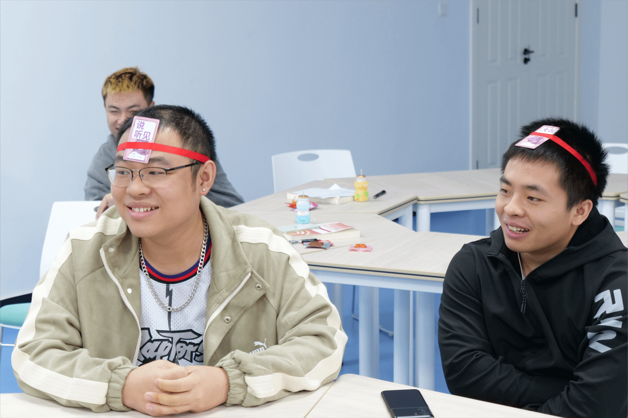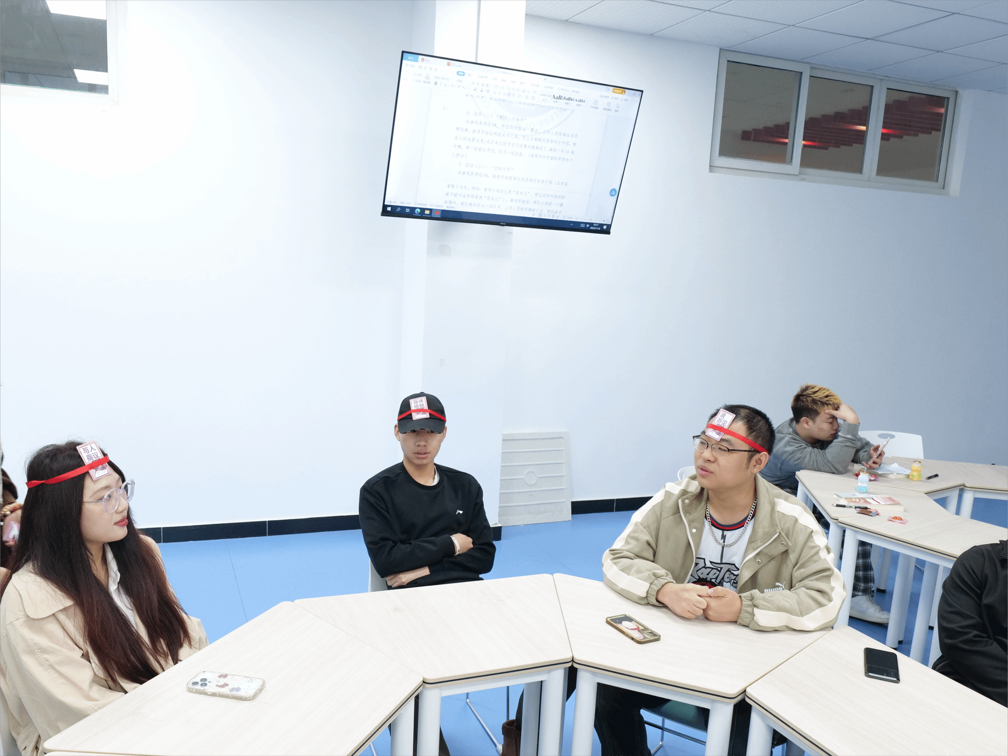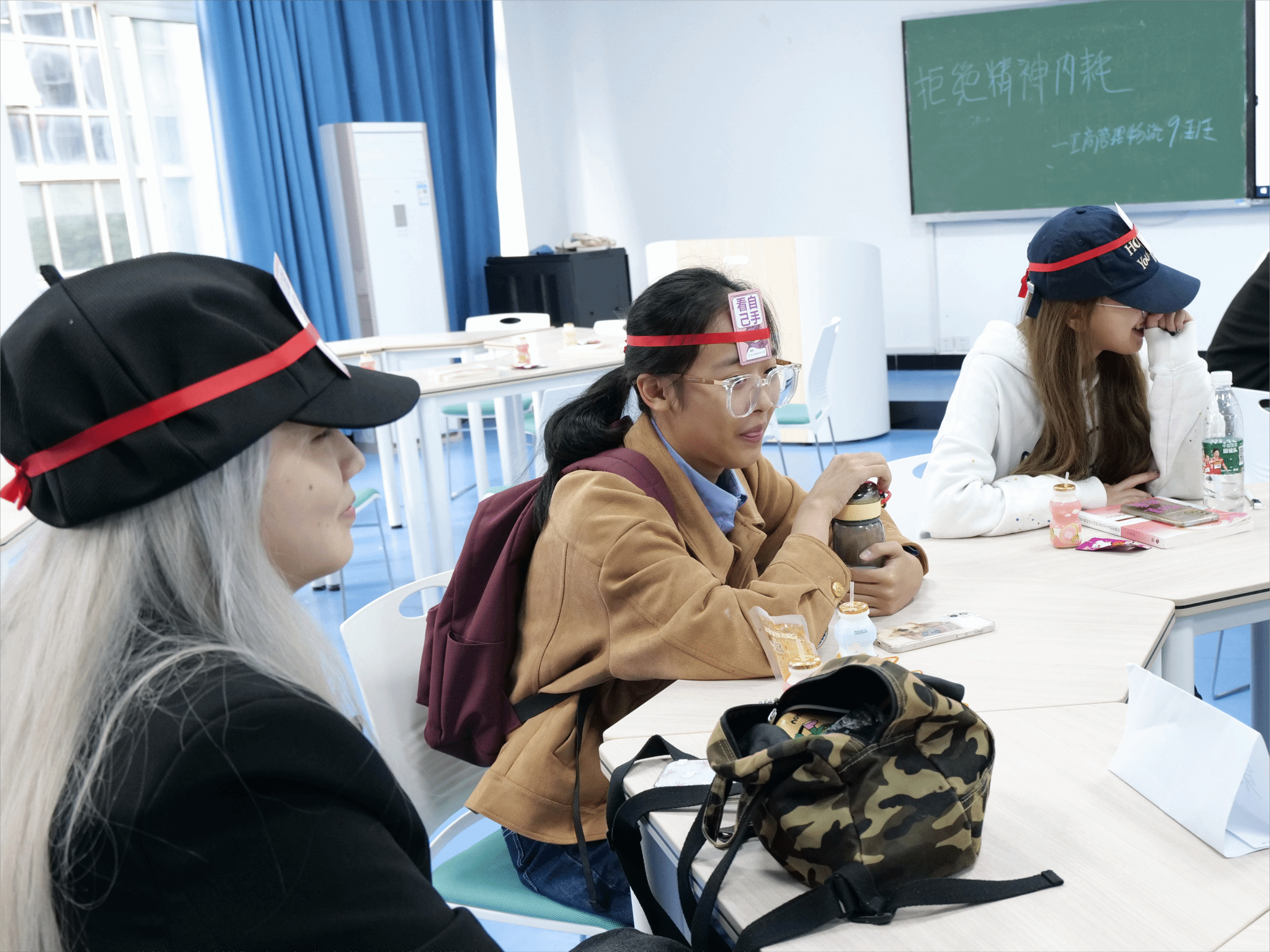 精神内耗就是自己在内心反反复复推敲一件还未发生的事情,对自己面对这件事的能力持怀疑态度,让自己惶恐不安。这就应该敞开心扉,学会察言观色。第三四组体验“害你心口难开”的游戏,工作人员将卡牌绑在每位参与同学头上,而参与同学需要引诱他人说出或做出与头上卡牌一样的词语和动作。这个环节考验了同学们善于观察和交际的能力,将对方带入自己的“陷进”并制裁,同时也要提高警惕不要被别人轻松带偏。两小组成员之间相互配合默契,一片欢声笑语。