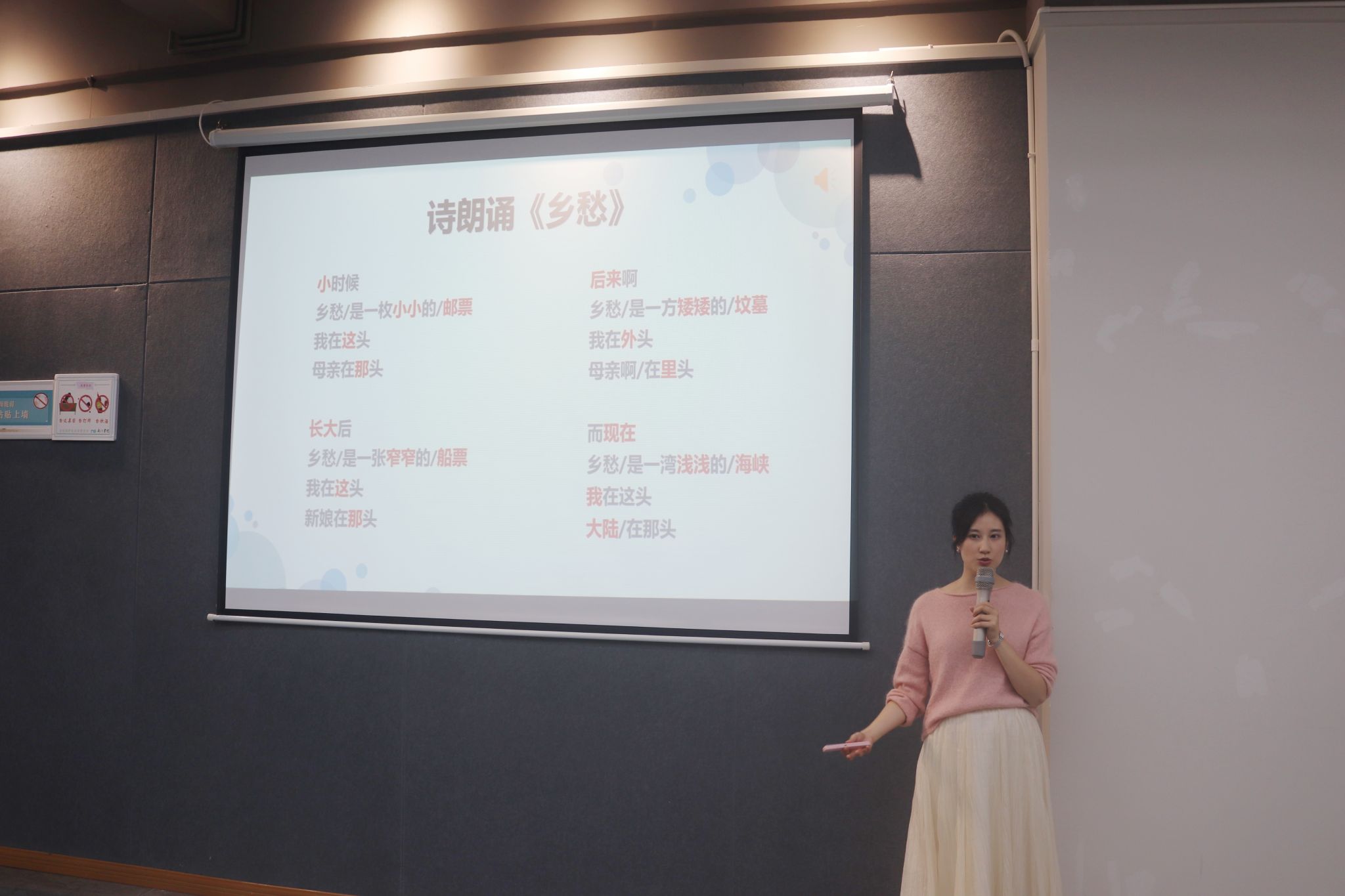 情感的融入是学好普通话的必要条件。邓巧老师建议同学们在做针对性学习时,多以诗歌文化为主;选择练习的素材时,多注意诗词歌赋中所表达的情感,透过文字去探索作者内心世界,感受丰富的思想情感,并试着将自身代入其中。邓老师以《乡愁》这首诗为例,带领同学们走进了余光中的“乡愁”。在深入学习语句的情感表达中,增强同学们自身谈吐深度,培养自身儒雅气质。