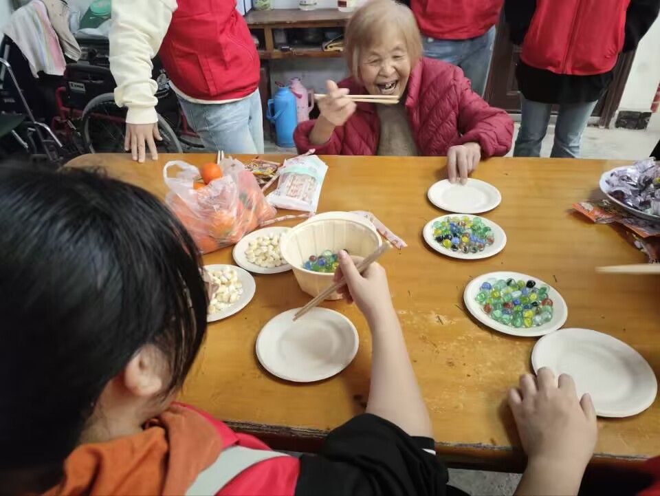 考虑到老年人因年岁增长而导致身体机能逐渐减弱,因此,为了增强老年人手部灵活性,2022级工商管理类01团支部为老人们准备了夹玻璃珠的游戏。在规定的时间内,老人需要尽可能多地夹取玻璃珠,竞逐胜利。玻璃珠在阳光的照射下闪闪发光,老人们小心翼翼地观察,用筷子巧妙地夹取,成功地将之移至空盘中。紧接着是第二个游戏——抢板凳,老人们由于身体原因无法进行剧烈运动,志愿者们为了让老人们也能够参与其中,让他们担任裁判。2022级工商管理类01团支部成员分处不同位置,各就各位。由担任裁判的老人背对着参与者敲击腰鼓,参与成员绕着板凳跑起来,一旦腰鼓声停,支部成员争抢椅子,直至决出第一名。