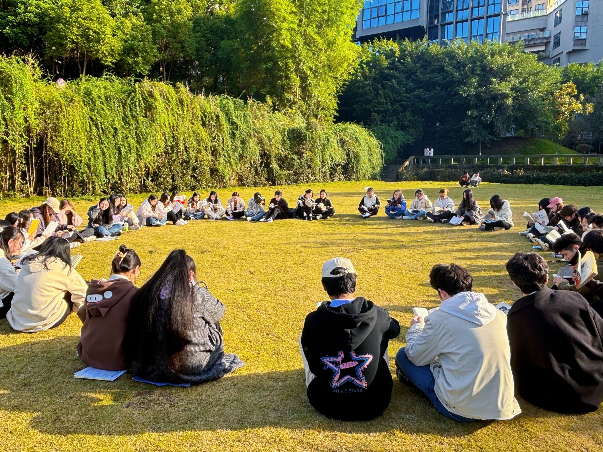 为引导同学们养成良好的阅读习惯,激发同学们的阅读兴趣,帮助其更加积极地投入到阅读活动中,淬炼商学院工商管理类9班和11班于2023年11月16日于双子湖草坪联合开展以“点亮心灵之光,知识与自然碰撞”为主题的阅读分享会,此次活动旨在促进同学们之间友善交流互动,提高同学们的阅读能力、文化素养和分析理解能力。