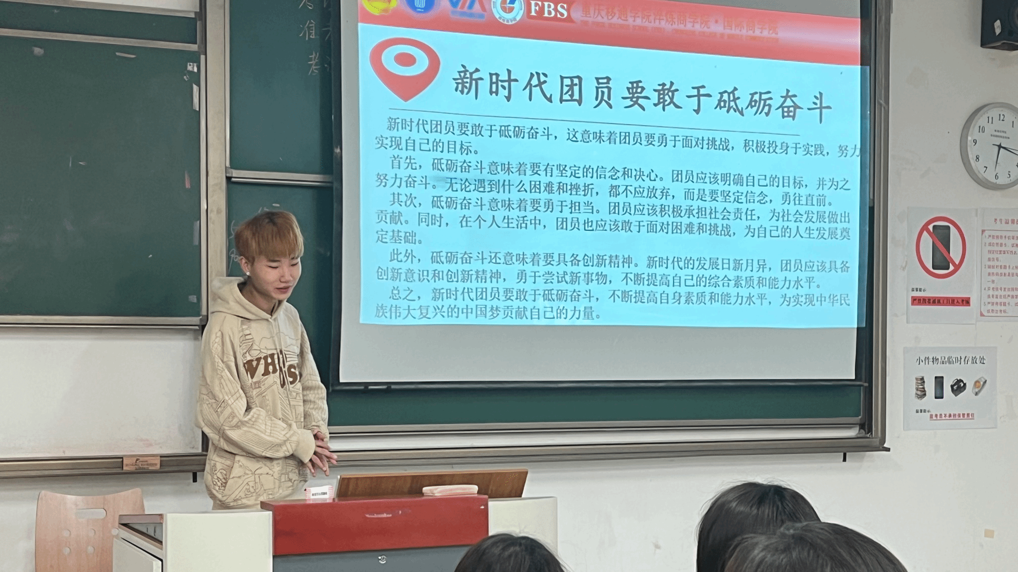 青年兴则国家兴,青年强则国家强。“青春孕育无限希望,青年创造美好明天。淬炼商学院学生会主席团成员谭泽瑞对大家说,“青年是实现中国梦的主力军,新时代青年要敢于砥砺奋斗,奋斗是青春最亮丽的底色,行动是青年最有效的磨砺。”有责任有担当,青春才会闪光。向大家指出砥砺奋斗意味着要有坚定的信念和决心,只有主动锻铸理想信念,掌握丰富知识,自觉锤炼高尚品格,才能做到新时代的有为青年,才能成长为可以担当民族复兴大任的时代新人。