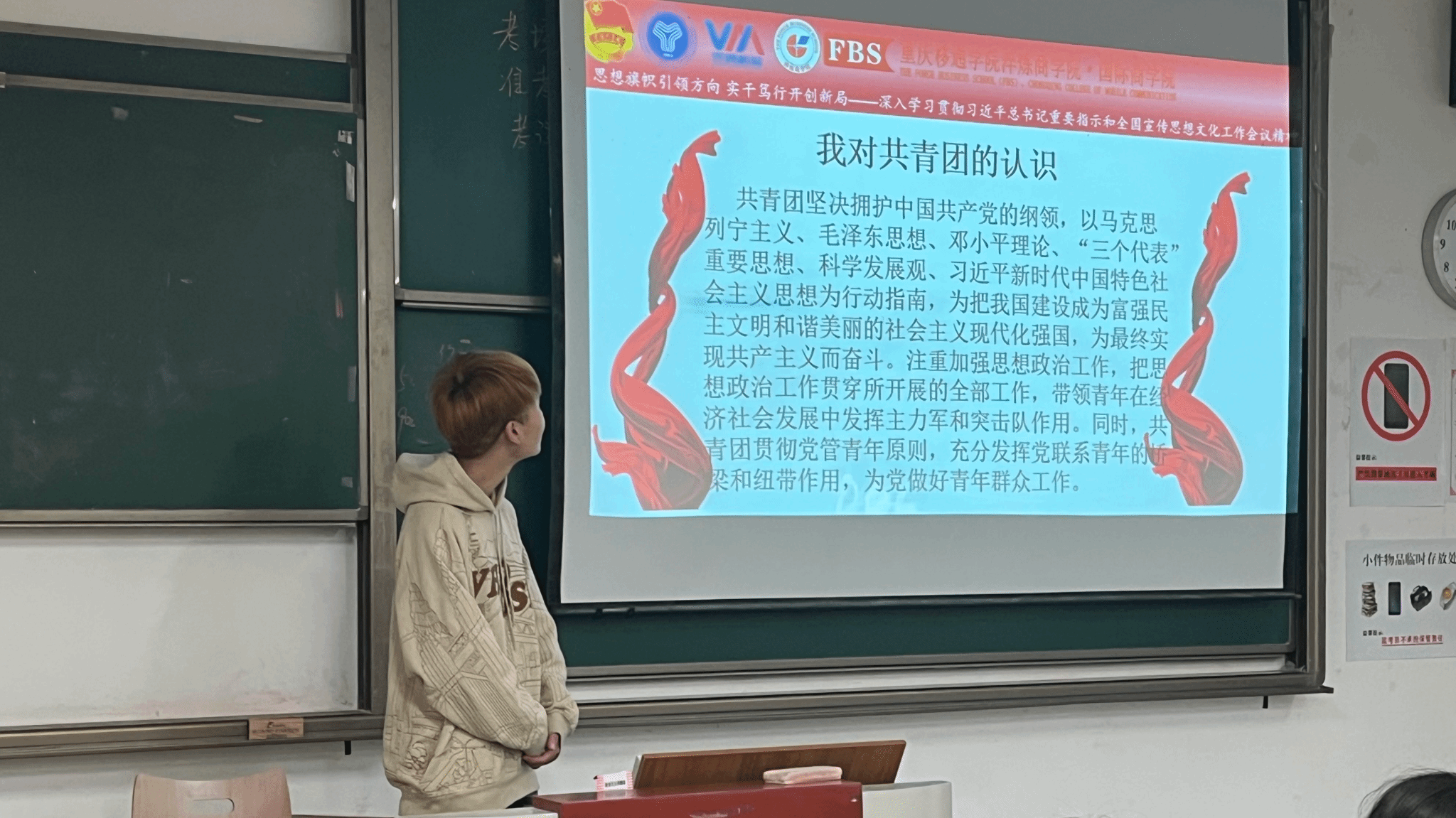 百年征程,塑造了共青团坚持党的领导的立身之本,塑造了共青团坚守理想信念的政治之魂,塑造了共青团扎根广大青年的活力之源。淬炼商学院学生会主席团成员谭泽瑞给大家讲述了他对共青团的认识,同时也向学生会骨干们强调身处于中国特色社会主义新时代,我们应当积极投身于中华民族复兴梦的伟大实践中,越是往前走、向上攀,越是要善于从走过的路中汲取智慧、提振信心、增添力量。让大家清楚了解共青团的伟大成就,增强对中国共产党辉煌成就和优秀理论成果的自豪感。