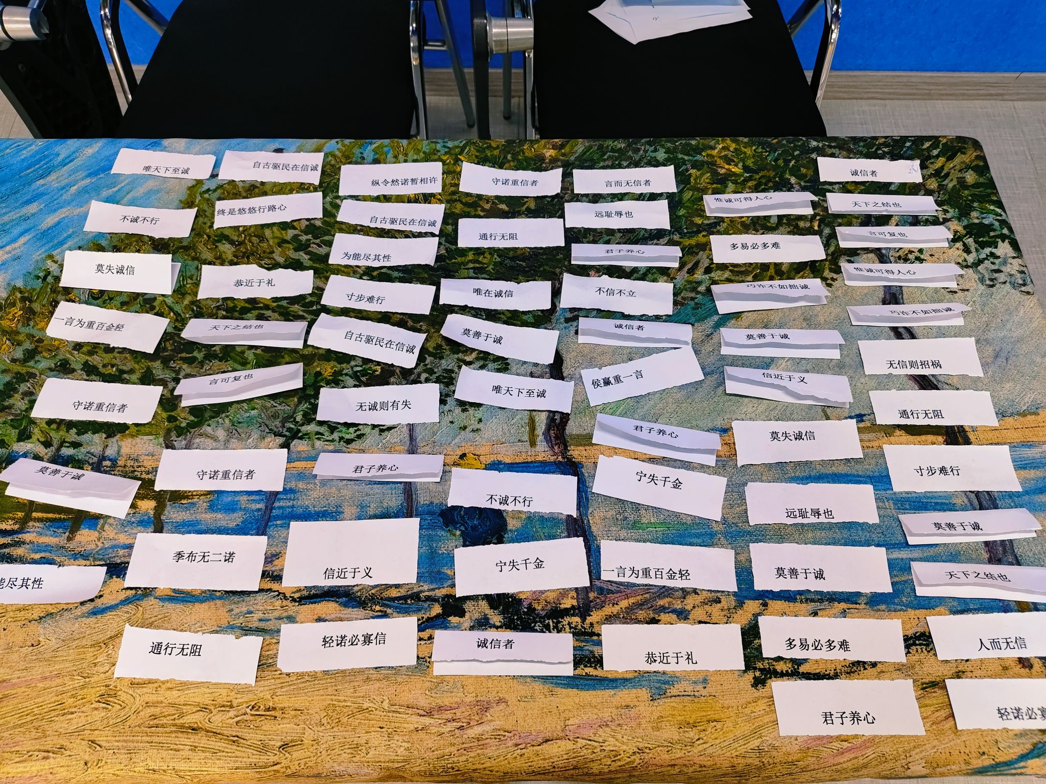 经过知识竞答与积极互动后,随即进入寻诚信名言环节,参与者在诚信名言打乱桌上找到正确的名言拼接在一起,看着大家找名言时的信心满满,相信这些诚信的名言警句始终在心中,到这里我们的活动也宣告。用这两个互动形式让青年大学生懂得了“有其言,无其行,君子之耻也”,如何为人处世。很多时候,一个“诚”字足以抵万金。诚信看似无形,却在潜移默化中塑造无数有形之身。
